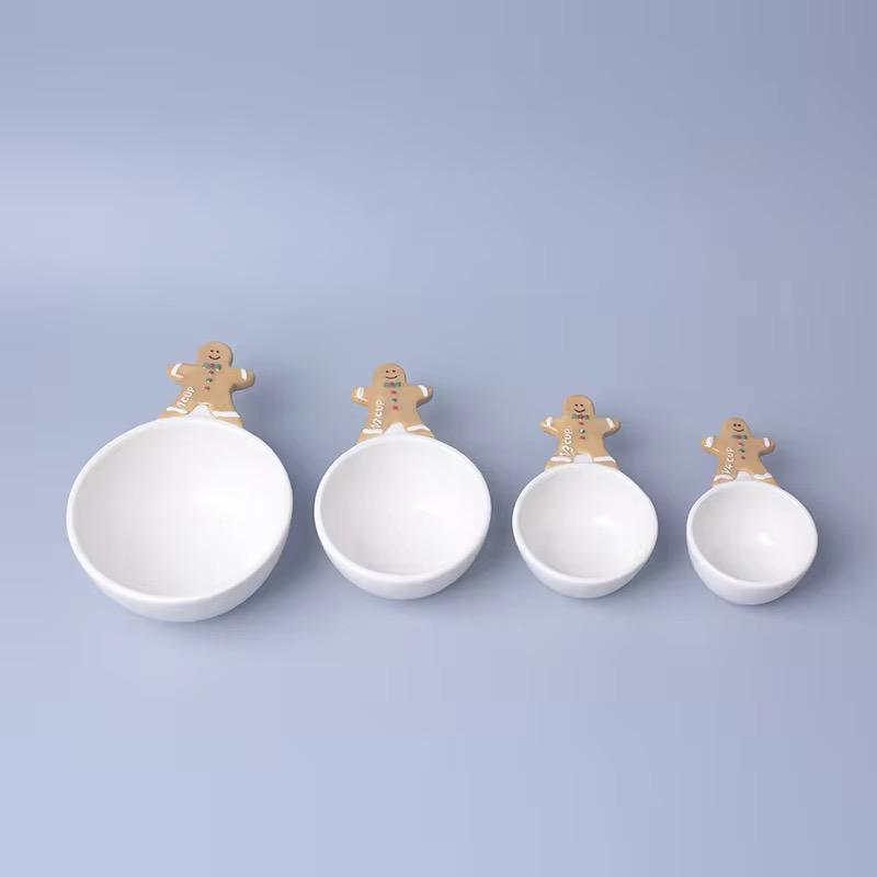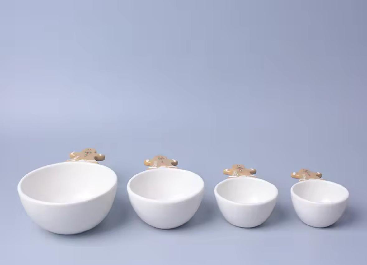 This set of four handcrafted white ceramic measuring bowls adds both functionality and whimsy to your kitchen. Each bowl features a plain, glossy white body, while the handles are sculpted in the shape of adorable gingerbread cookies, with each measurement clearly labeled on the handle itself.