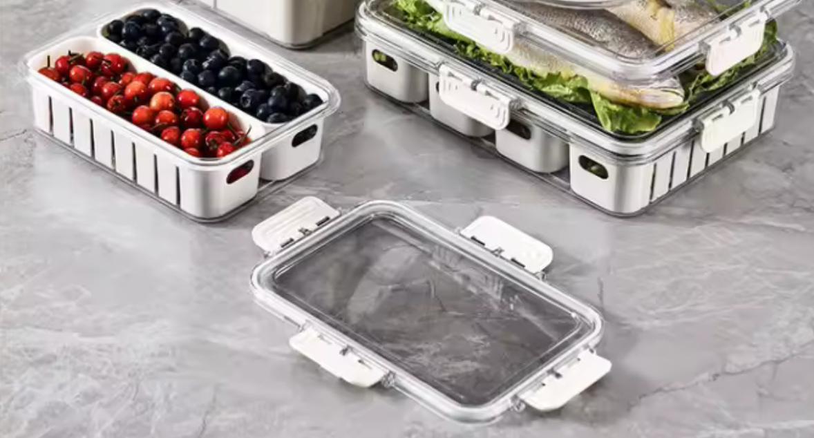 Keep your fruits, veggies, and snacks fresh and neatly separated with this dual-compartment fridge organizer. Designed with a transparent locking lid and smart air vents, it helps maintain optimal freshness while letting you see the contents at a glance.