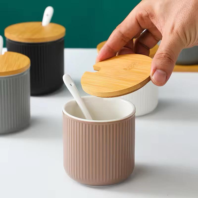 • Material: High-quality ceramic jars with wooden lids & tray