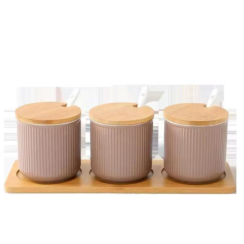 Add warmth and elegance to your kitchen countertop with our Ceramic Spice Jar Canister Set – a set of 3 sleek, brown-toned jars nestled on a wooden tray. Each jar is topped with a smooth wooden lid and comes with a ceramic spoon, making it perfect for storing your everyday spices, salt, sugar, or condiments in style.