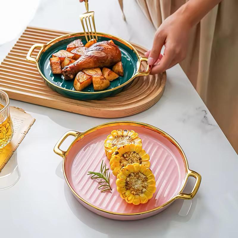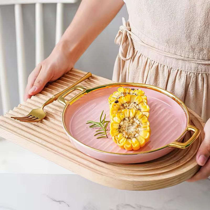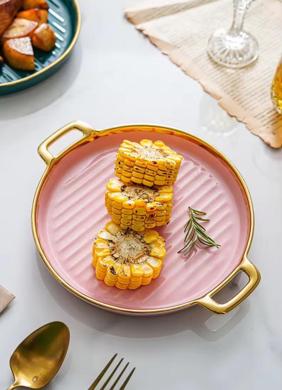 Crafted in a beautiful circular shape, this tray features engraved grill-inspired lines for a unique texture and visual appeal. The rich golden border and twin golden handles add a sophisticated sparkle that stands out whether you’re entertaining guests or styling your home.