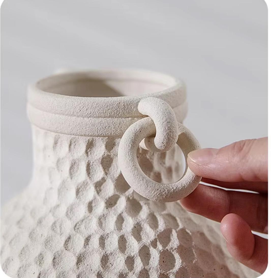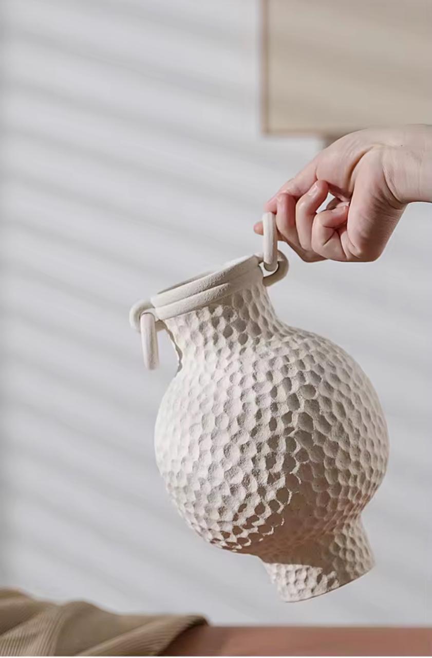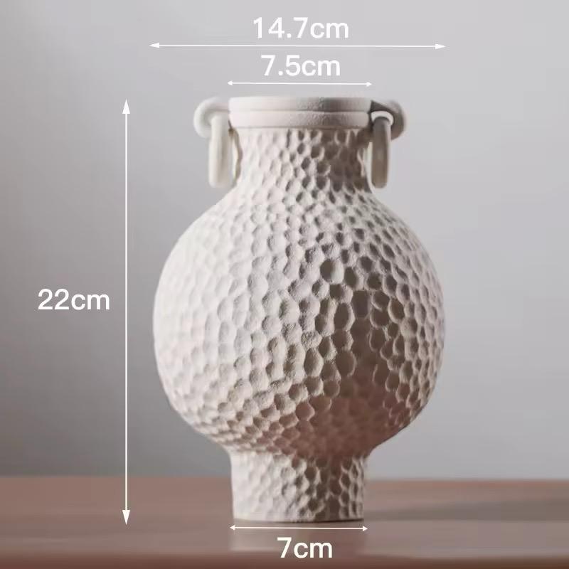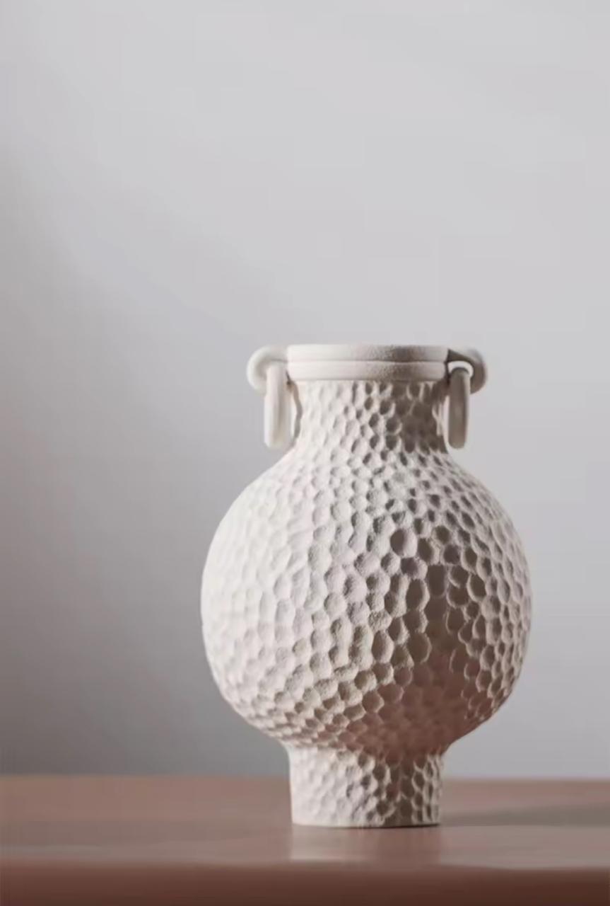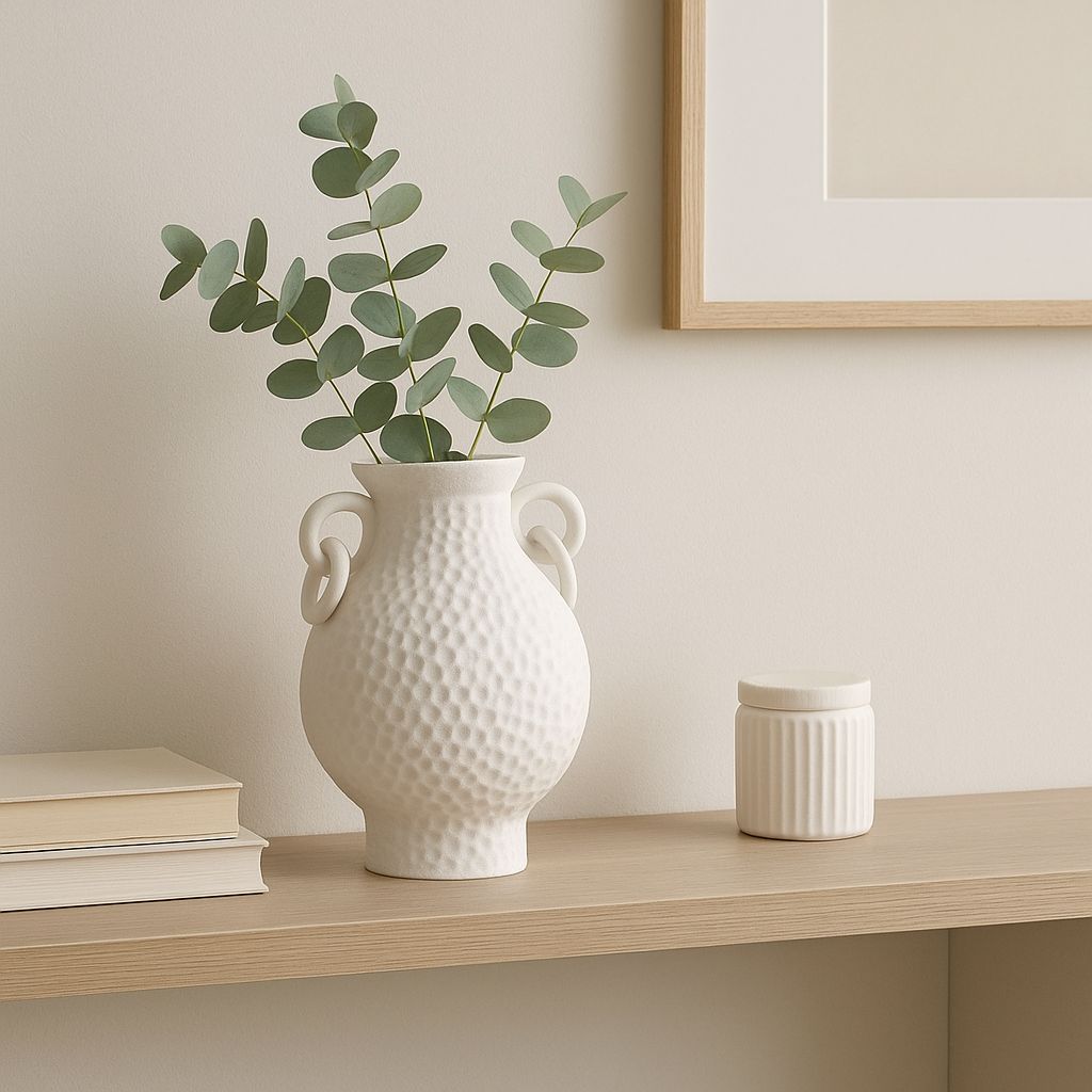 where modern art meets functional elegance. Crafted from high‑quality white ceramic, its all‑around hammered texture catches light and shadow, while the pair of sculptural ring handles adds an architectural twist. Perfect for single stems, small bunches, or simply as a standalone sculptural accent, it brings a refined yet playful touch to mantels, console tables, or sideboards.