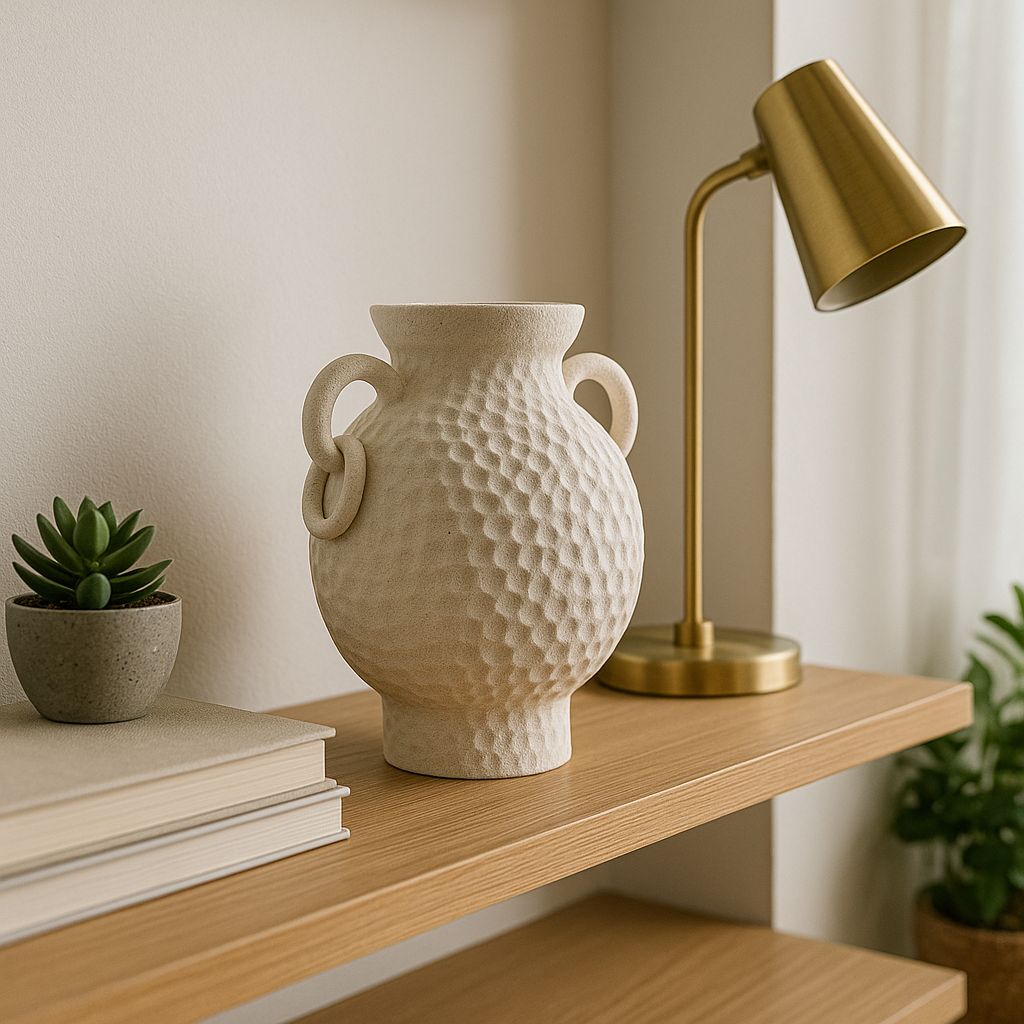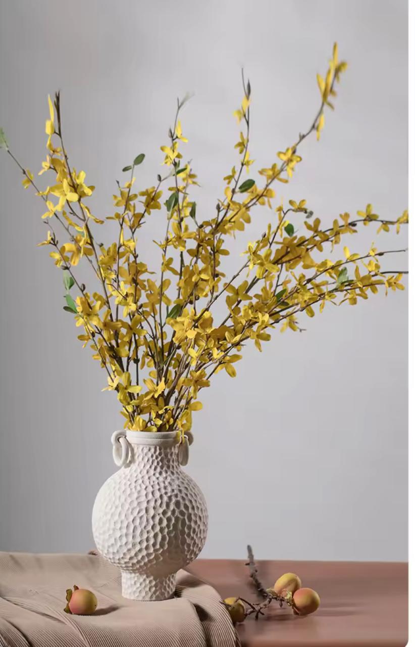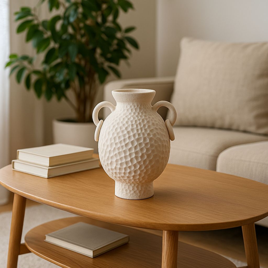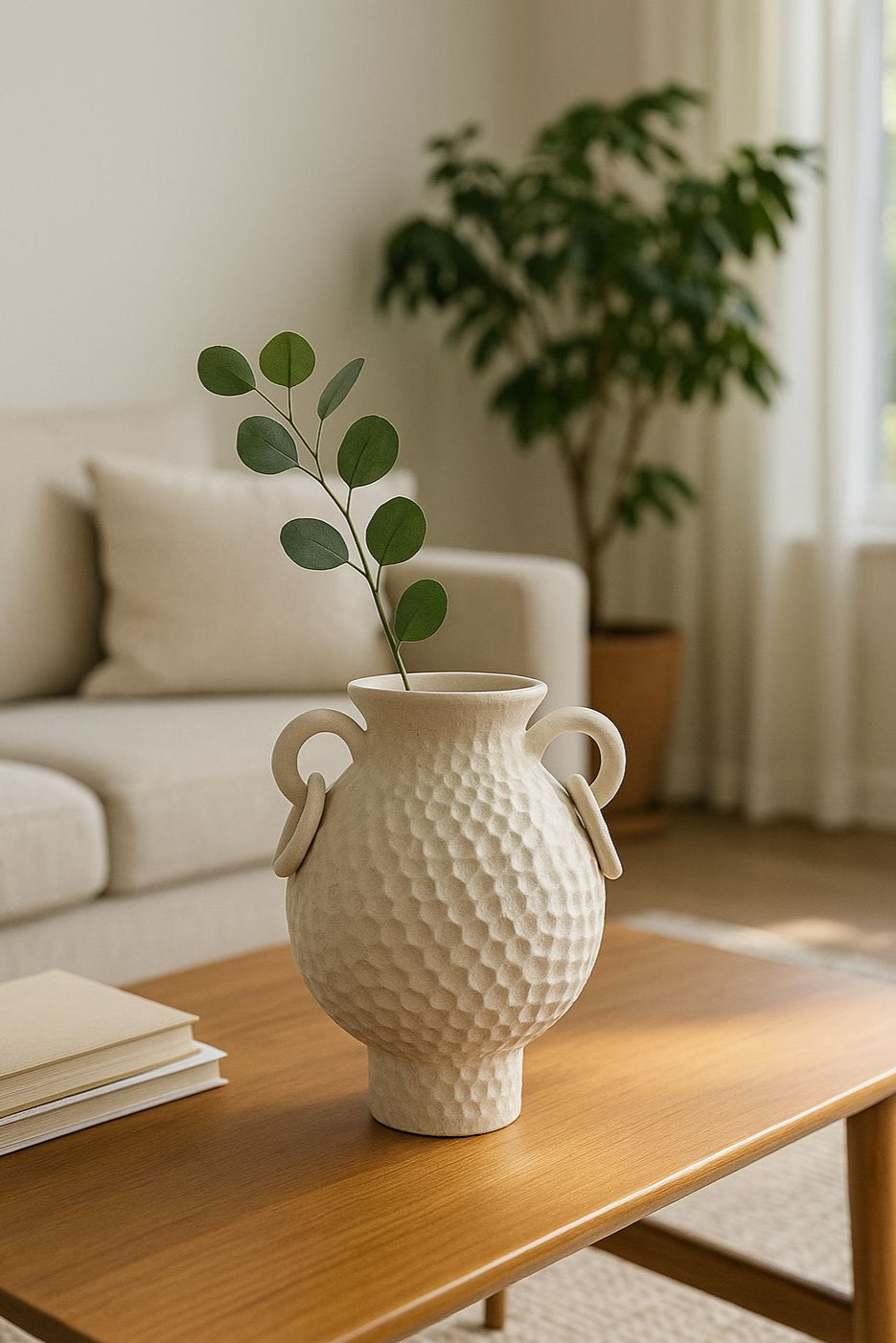 where modern art meets functional elegance. Crafted from high‑quality white ceramic, its all‑around hammered texture catches light and shadow, while the pair of sculptural ring handles adds an architectural twist. Perfect for single stems, small bunches, or simply as a standalone sculptural accent, it brings a refined yet playful touch to mantels, console tables, or sideboards.