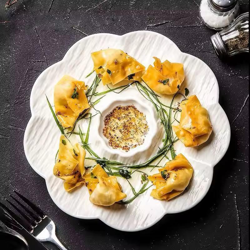 Add elegance and creativity to your table with our PetalServe Ceramic Dumpling Platter – a flower-shaped serving plate that’s both artistic and functional. Crafted from high-quality ceramic, this 9.5-inch (23.5 cm) plate features scalloped petal edges with a built-in center dip section, perfect for sauces, chutneys, or dips. The textured surface adds a rustic, handmade charm, making it ideal for serving dumplings, momos, snacks, sushi, and more.
