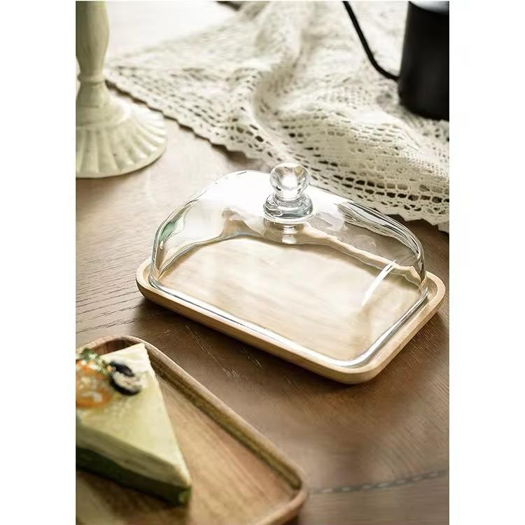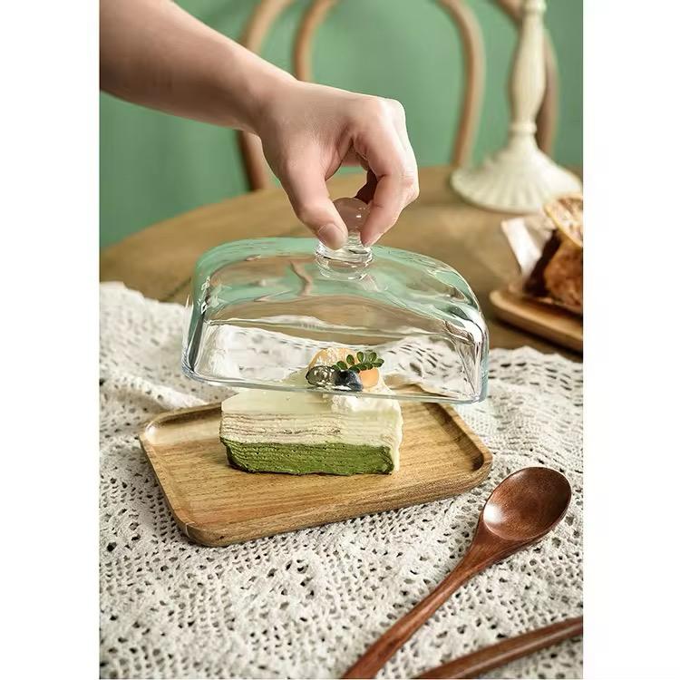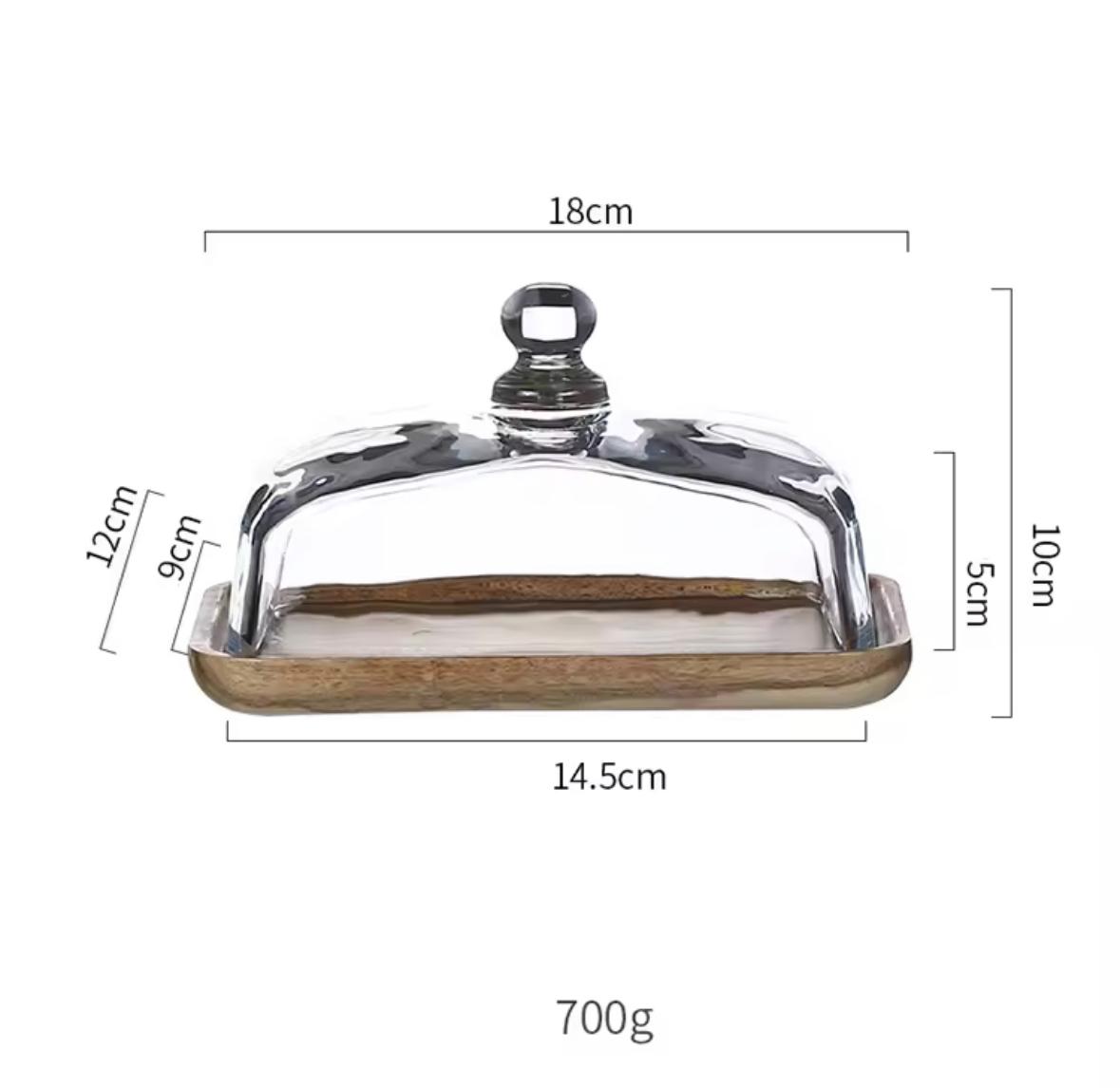 This handcrafted serving piece features a smooth wooden base with a clear, rectangular glass dome — designed to add charm and sophistication to your table. The dome includes a convenient knob on top for easy lifting, making it ideal for both functional use and visual appeal.