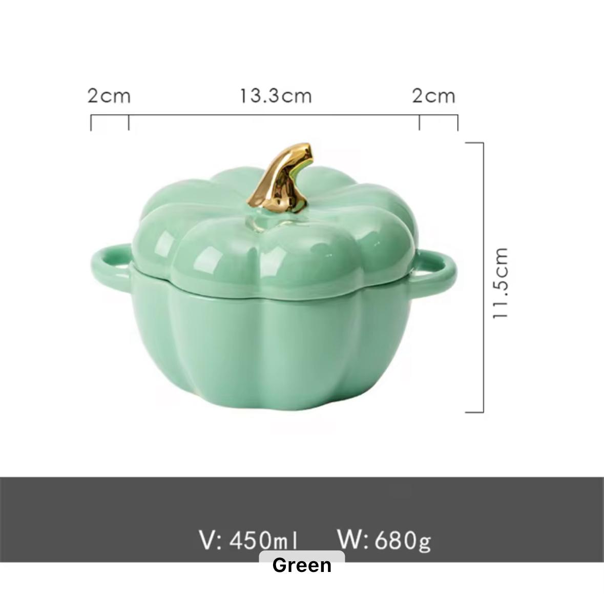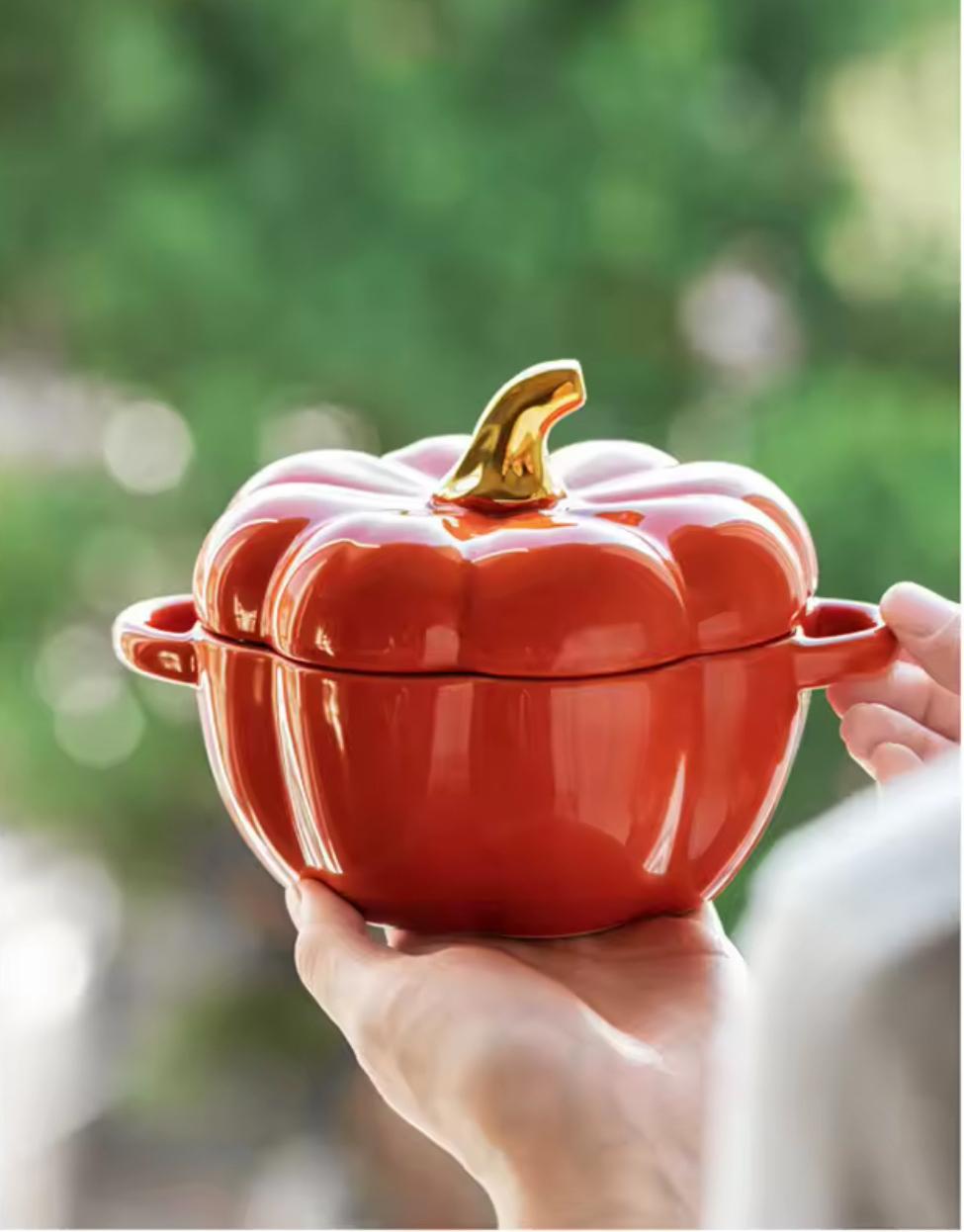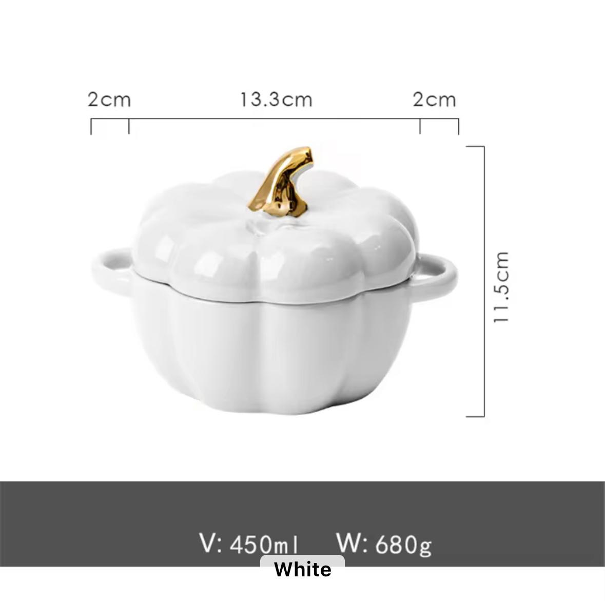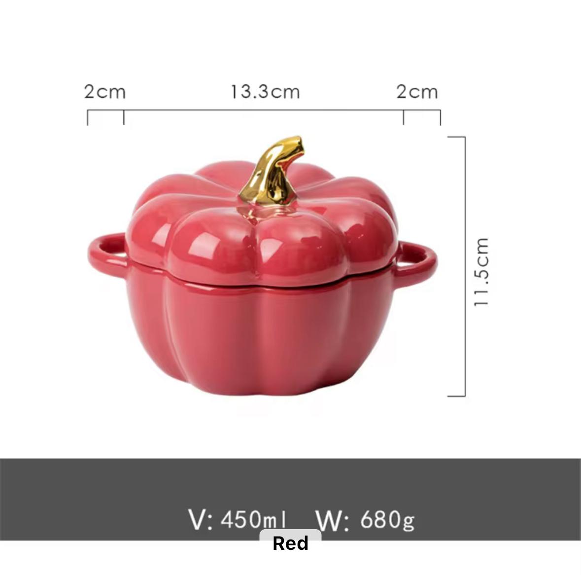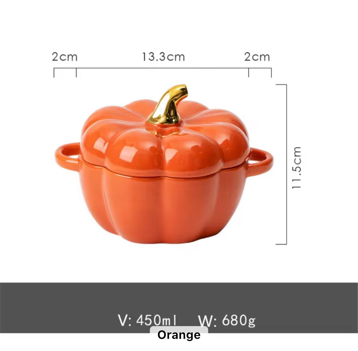 • Design: Pumpkin shape with two side handles and matching lid