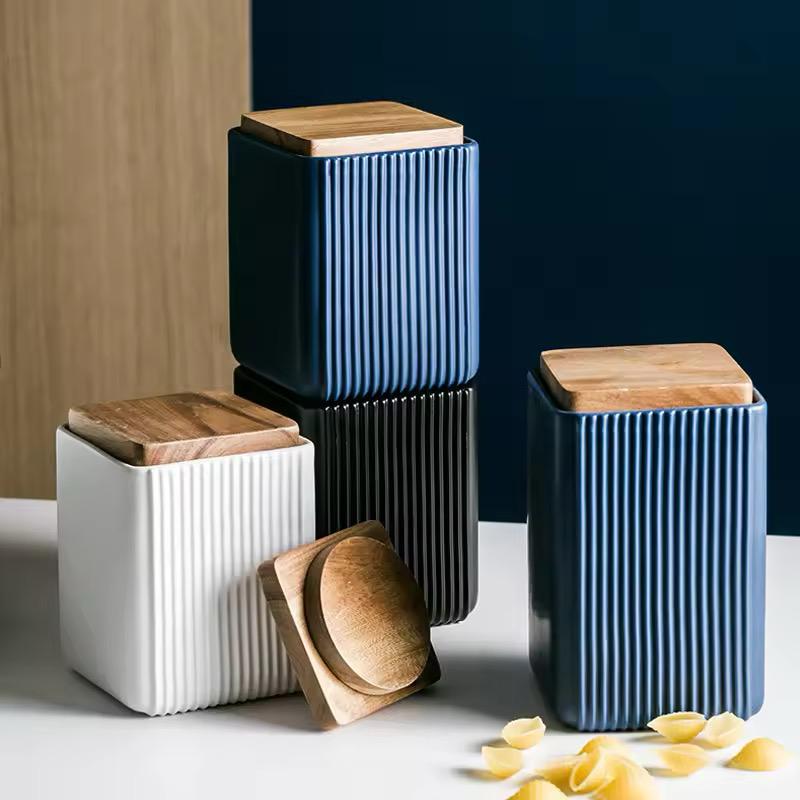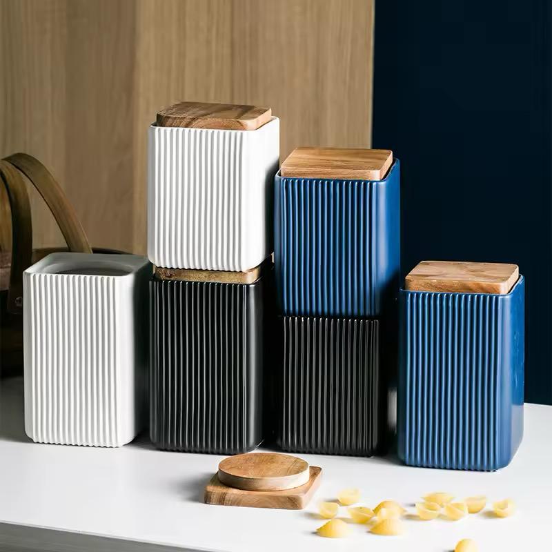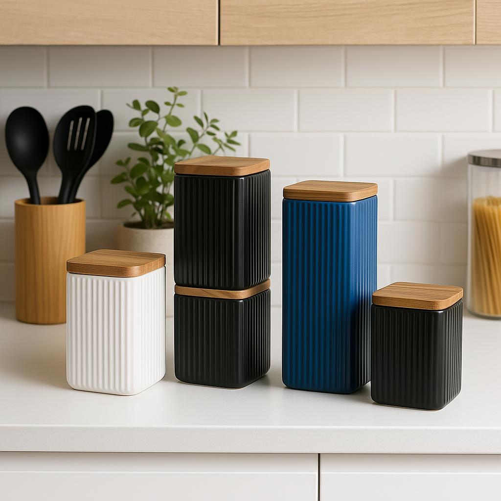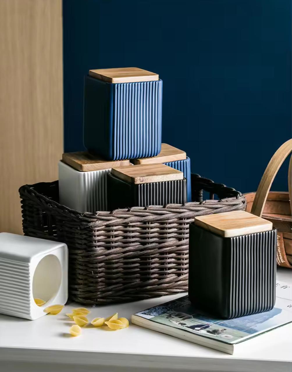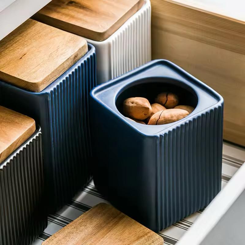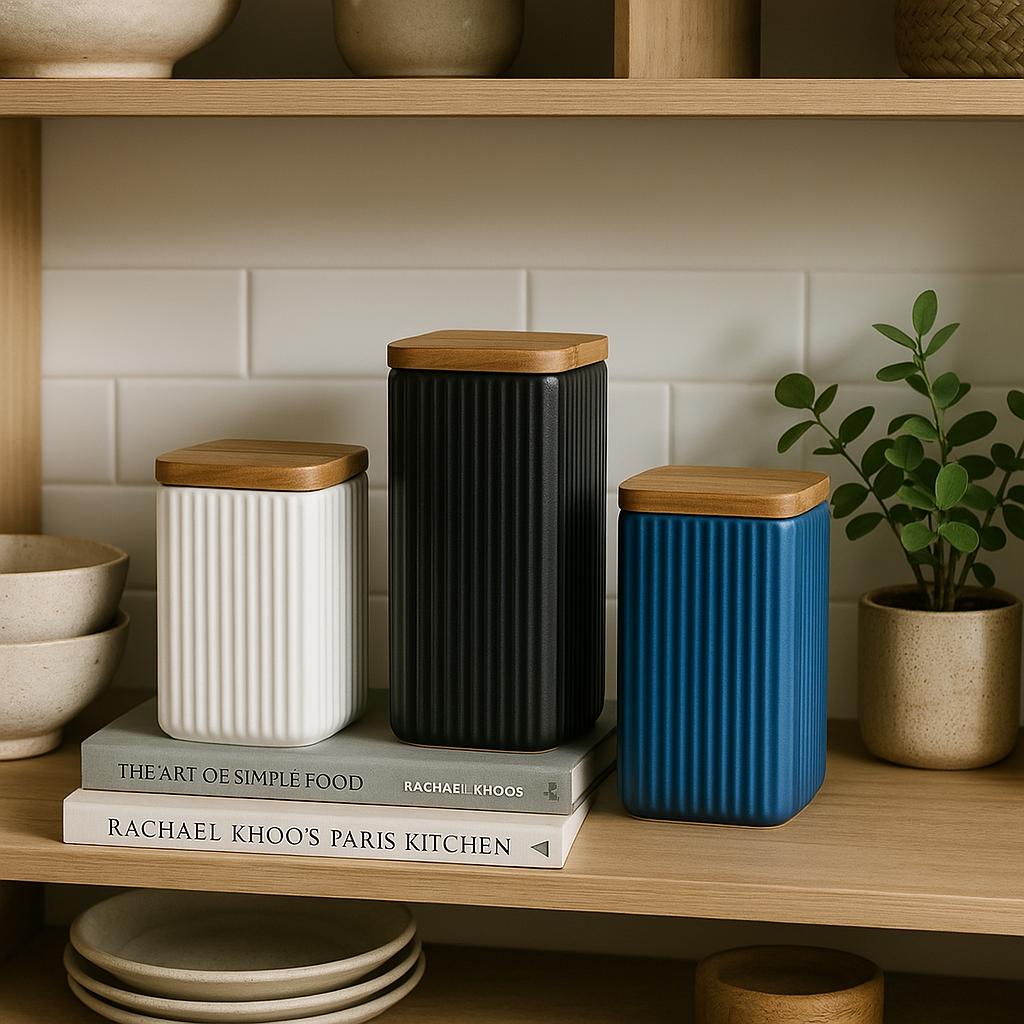 Crafted with a minimalist design, these jars feature a sleek, vertical ribbed texture and come in rich hues of white, black, and navy blue. Topped with a natural wooden lid, each canister is equipped with a food-safe silicone seal to keep your ingredients fresh.