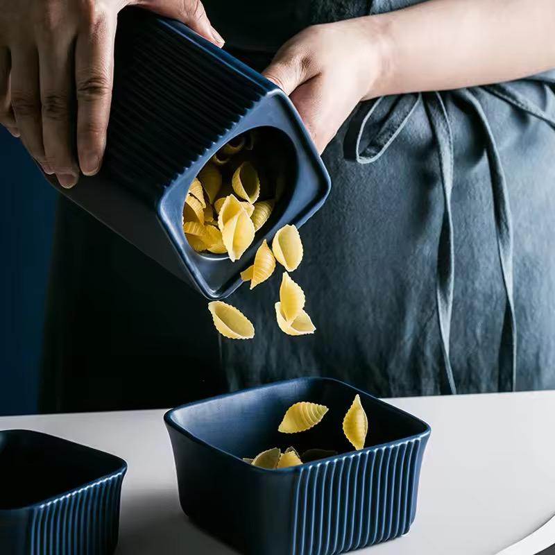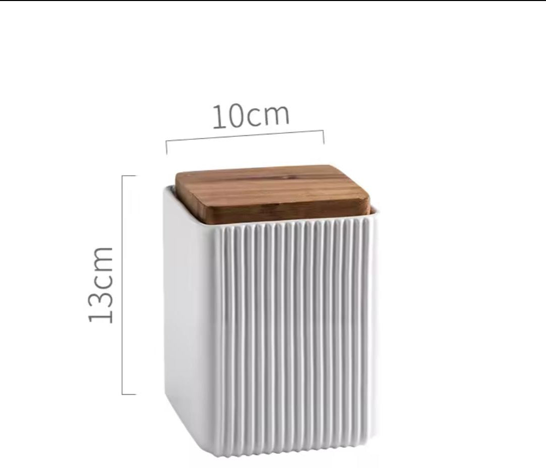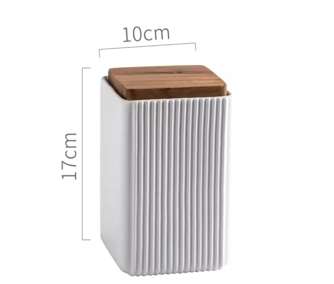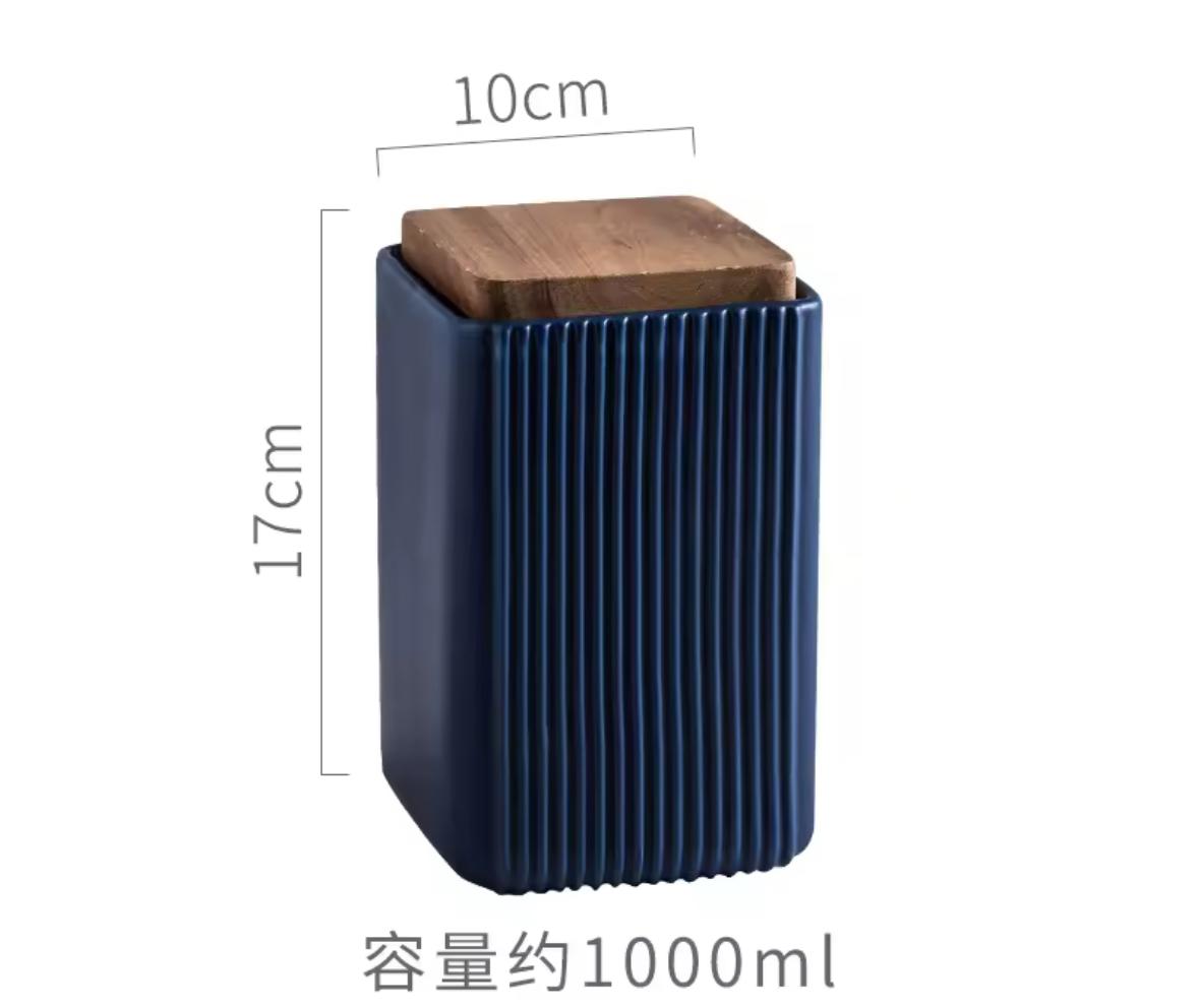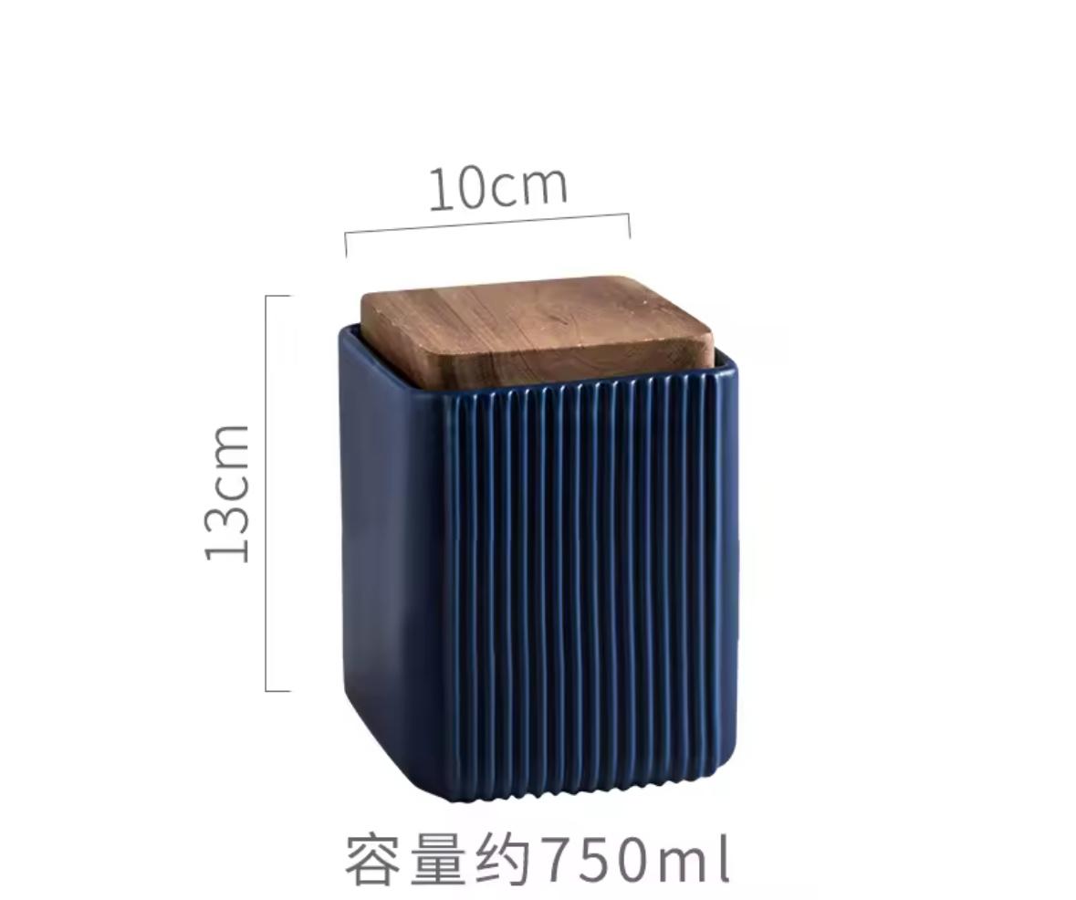 Crafted with a minimalist design, these jars feature a sleek, vertical ribbed texture and come in rich hues of white, black, and navy blue. Topped with a natural wooden lid, each canister is equipped with a food-safe silicone seal to keep your ingredients fresh.
