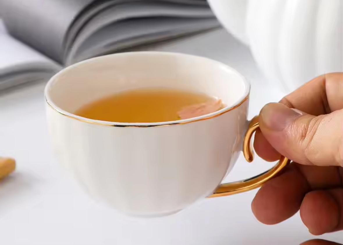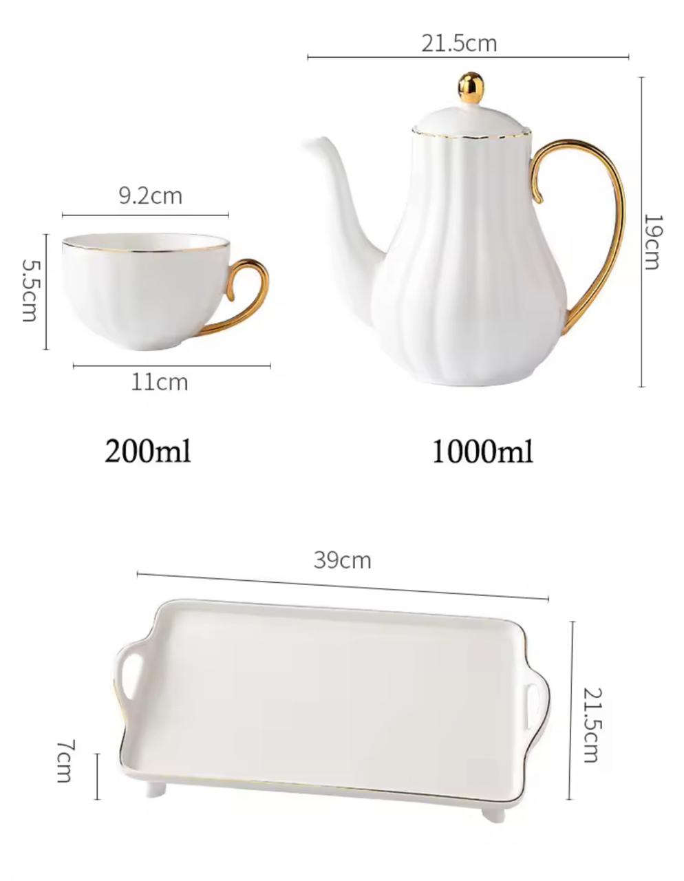 Crafted from high-quality porcelain, each piece is thoughtfully designed – the teapot pours smoothly, the cups offer a perfect sip, and the tray ensures graceful presentation with its golden side handles and raised base.