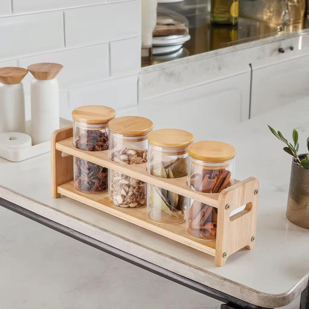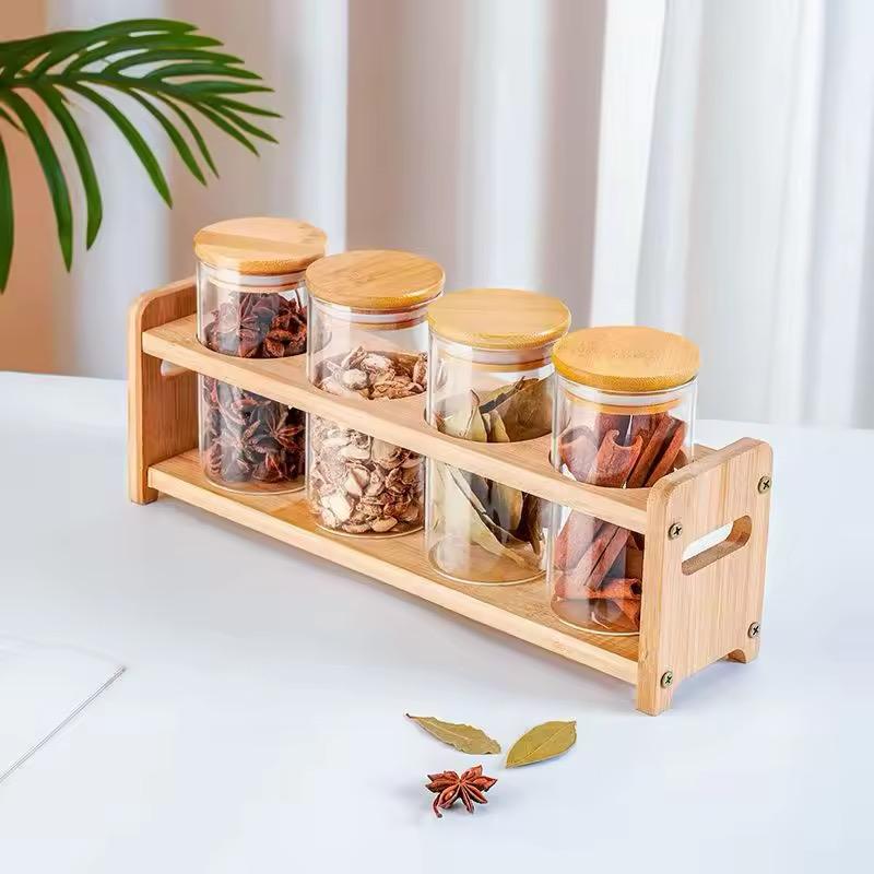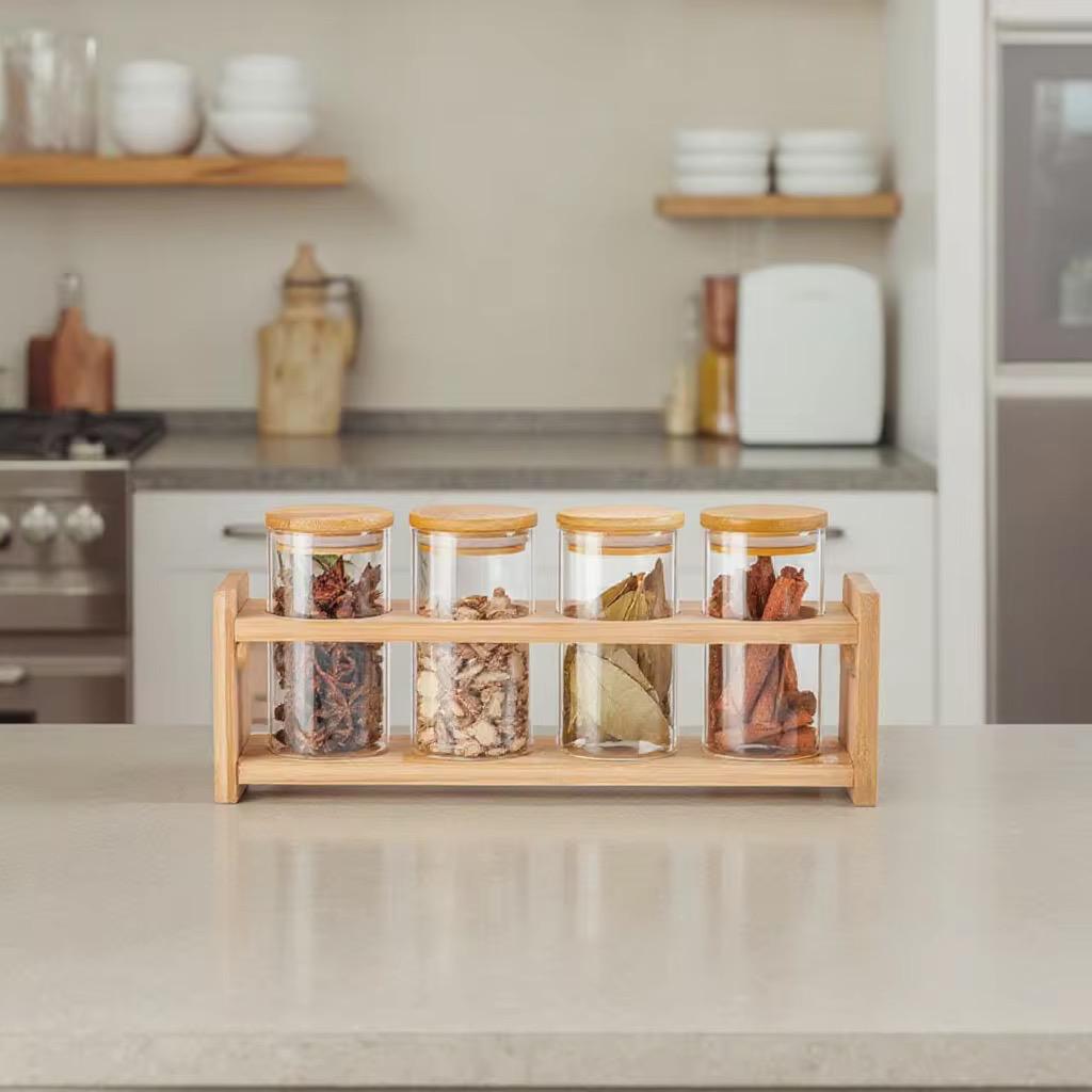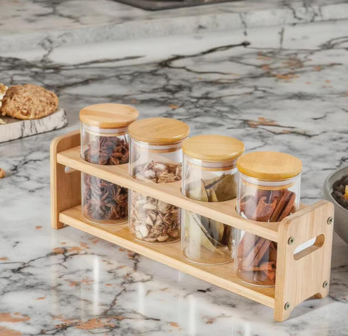 Set of 4 Glass Spice Jars with Airtight Wooden Lids & Wooden Holder