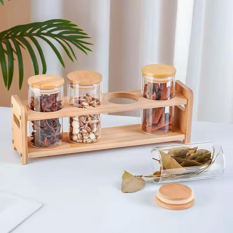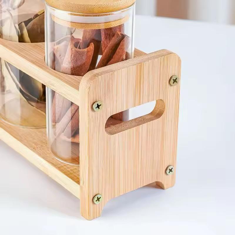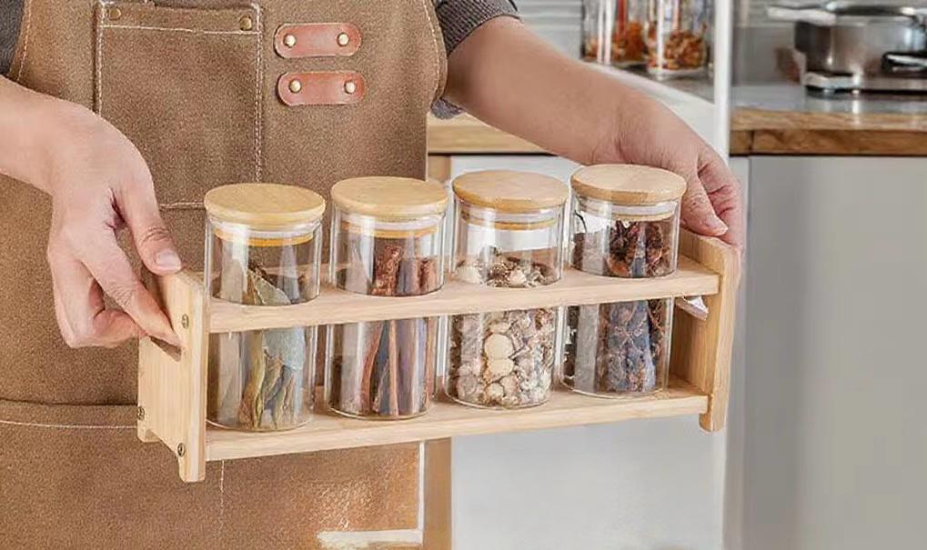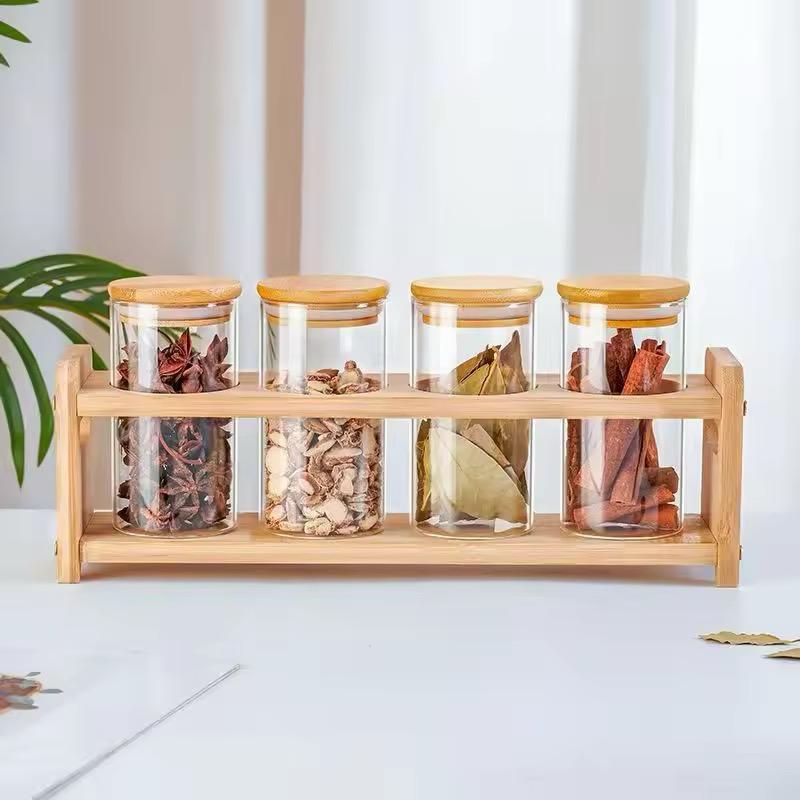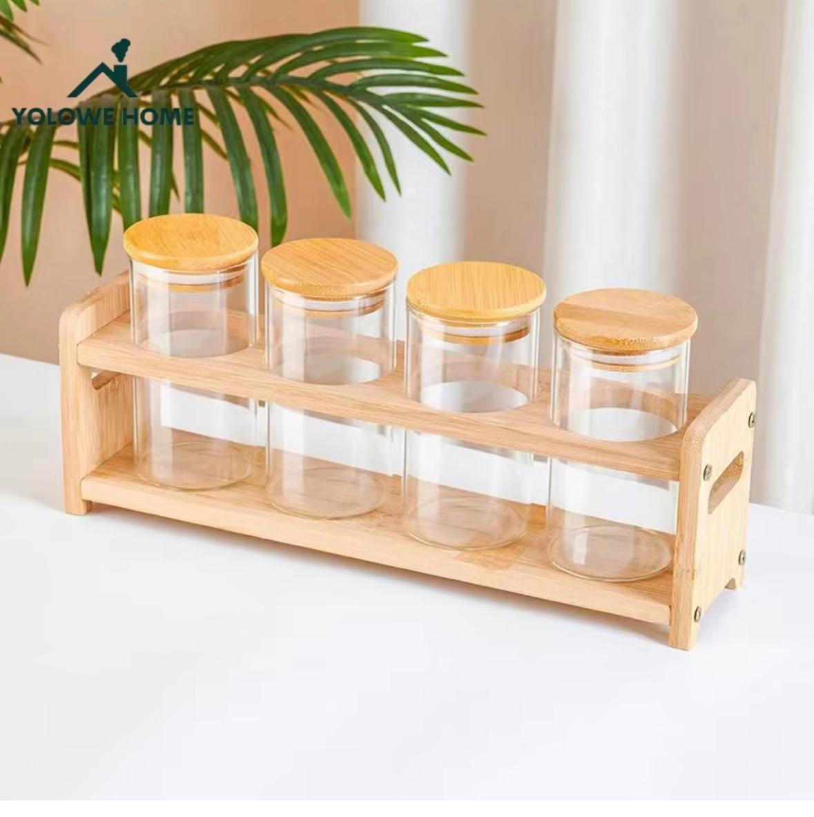 Set of 4 Glass Spice Jars with Airtight Wooden Lids & Wooden Holder