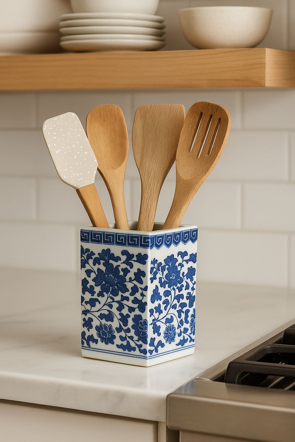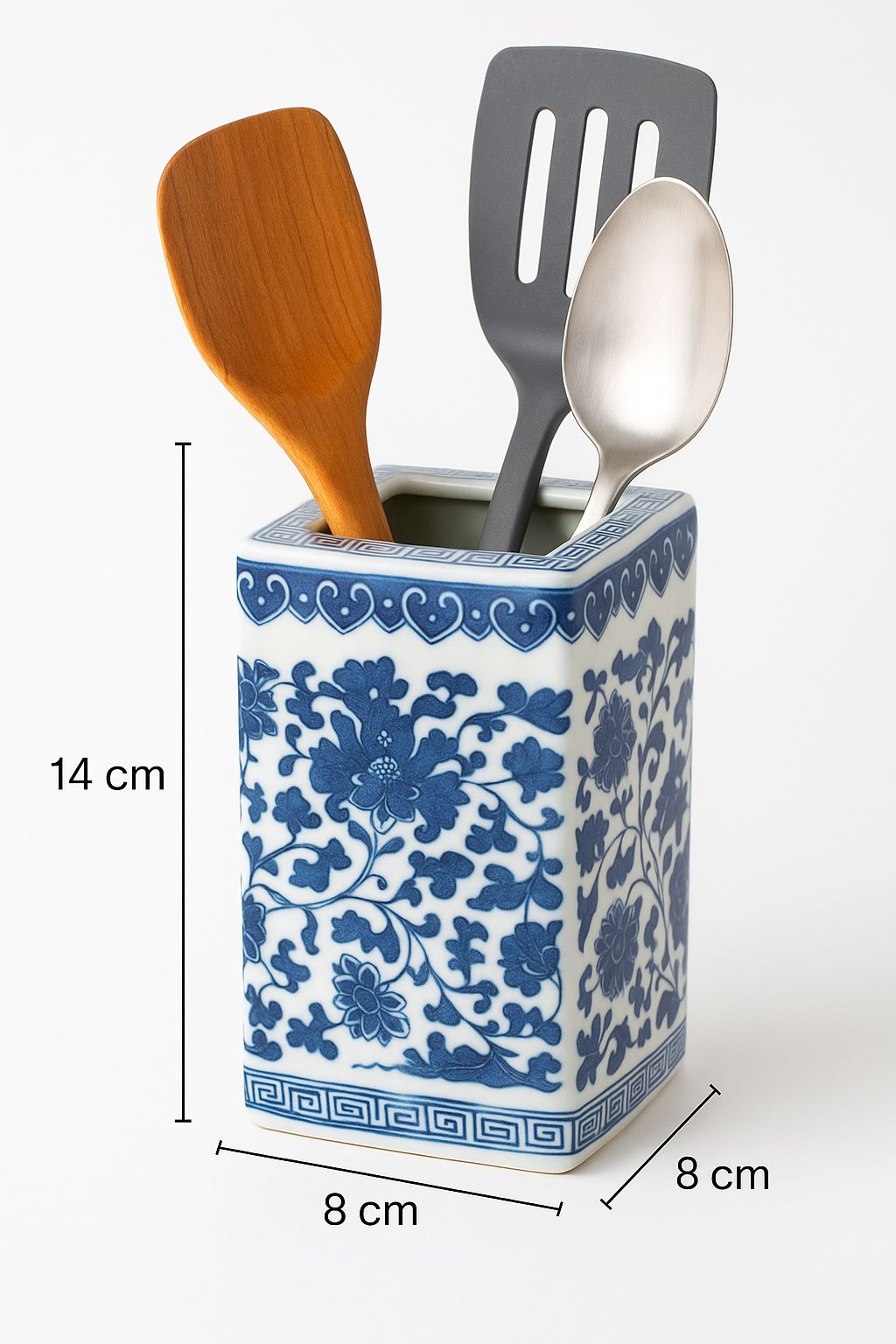 This square ceramic spatula holder is a perfect fusion of traditional charm and modern functionality. Hand-painted in classic blue floral motifs and bordered with timeless Grecian detailing, it’s a statement piece for your kitchen. Whether used to hold spatulas, ladles, or cutlery, its solid structure and smooth porcelain finish keep your essentials upright while elevating your space.