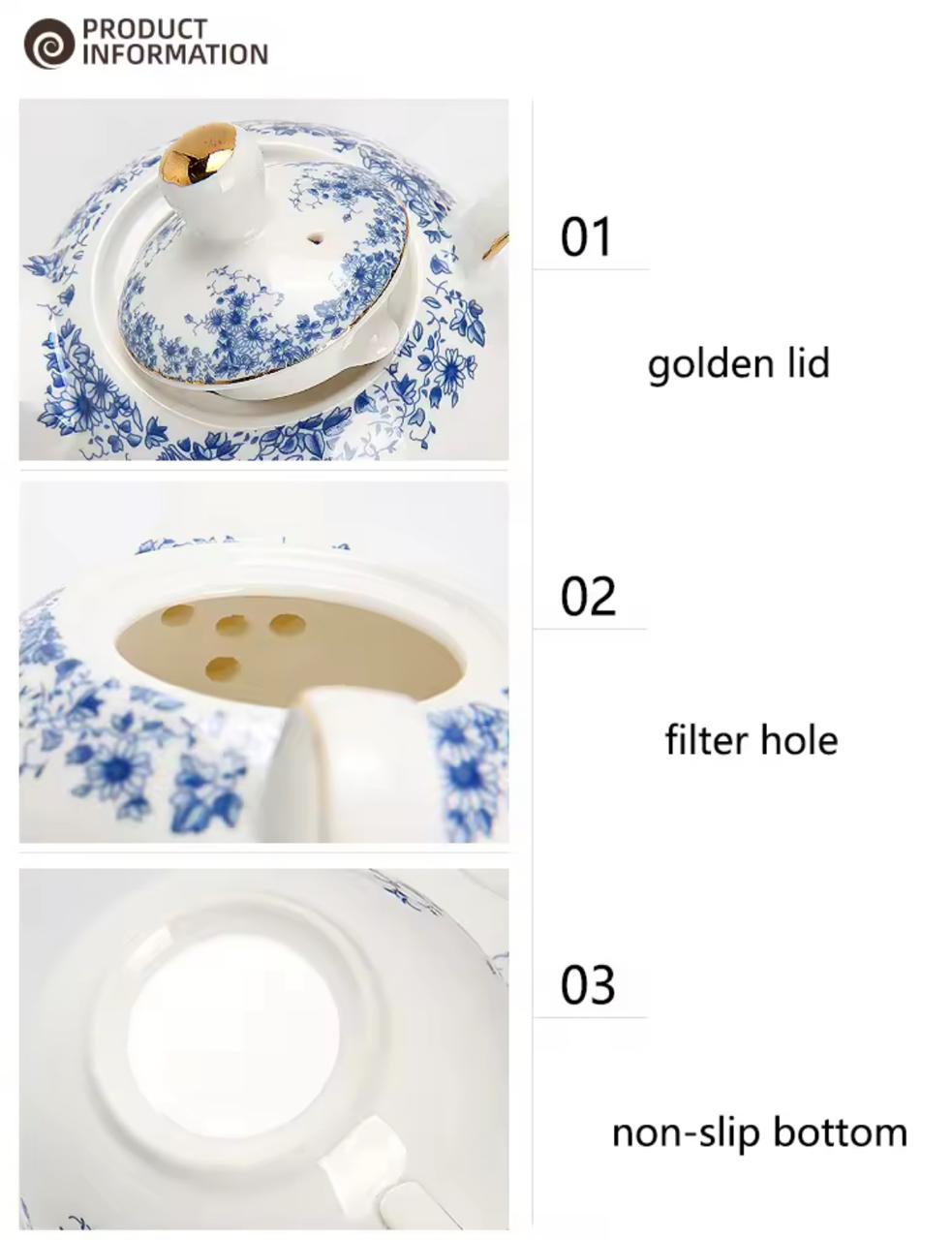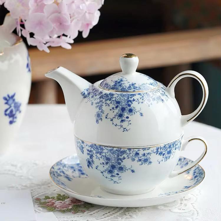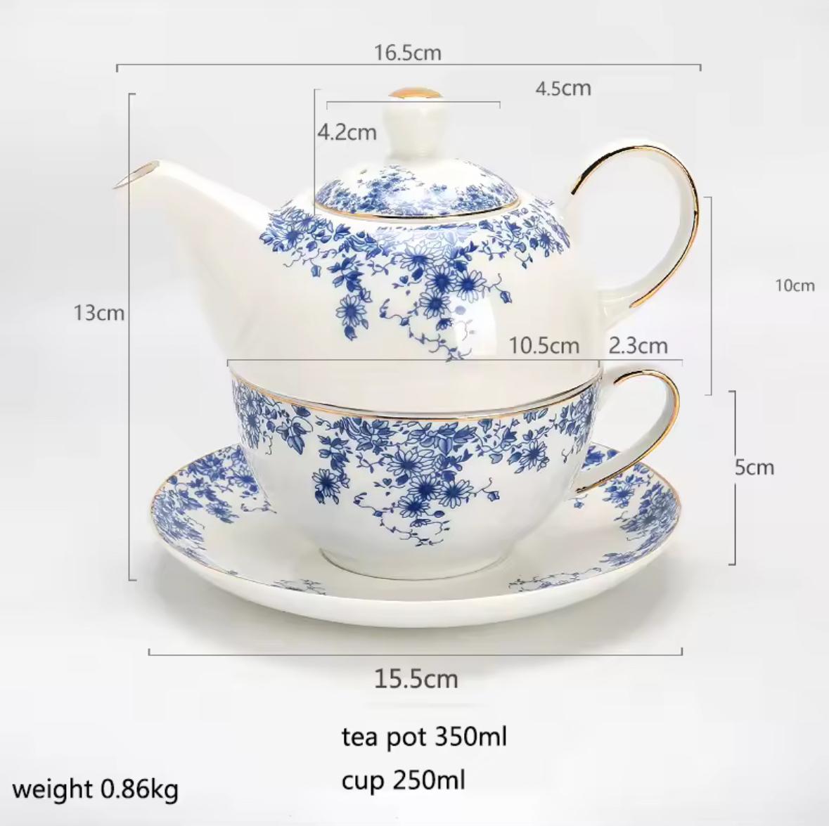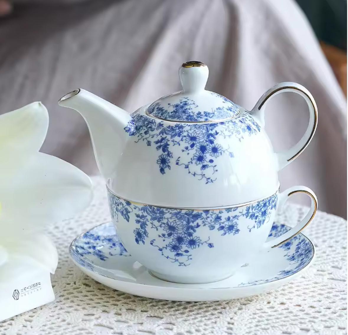 Designed thoughtfully for a single tea lover, the set features a 350ml teapot that rests neatly on top of a 250ml teacup and saucer — saving space while adding elegance. A golden spoon completes the set, adding just the right touch of luxury.
