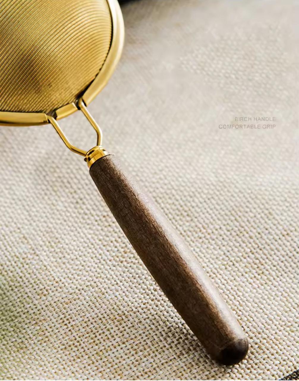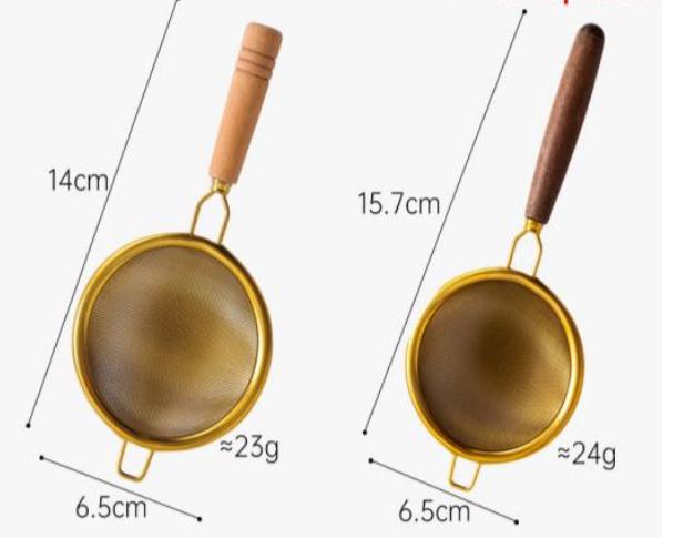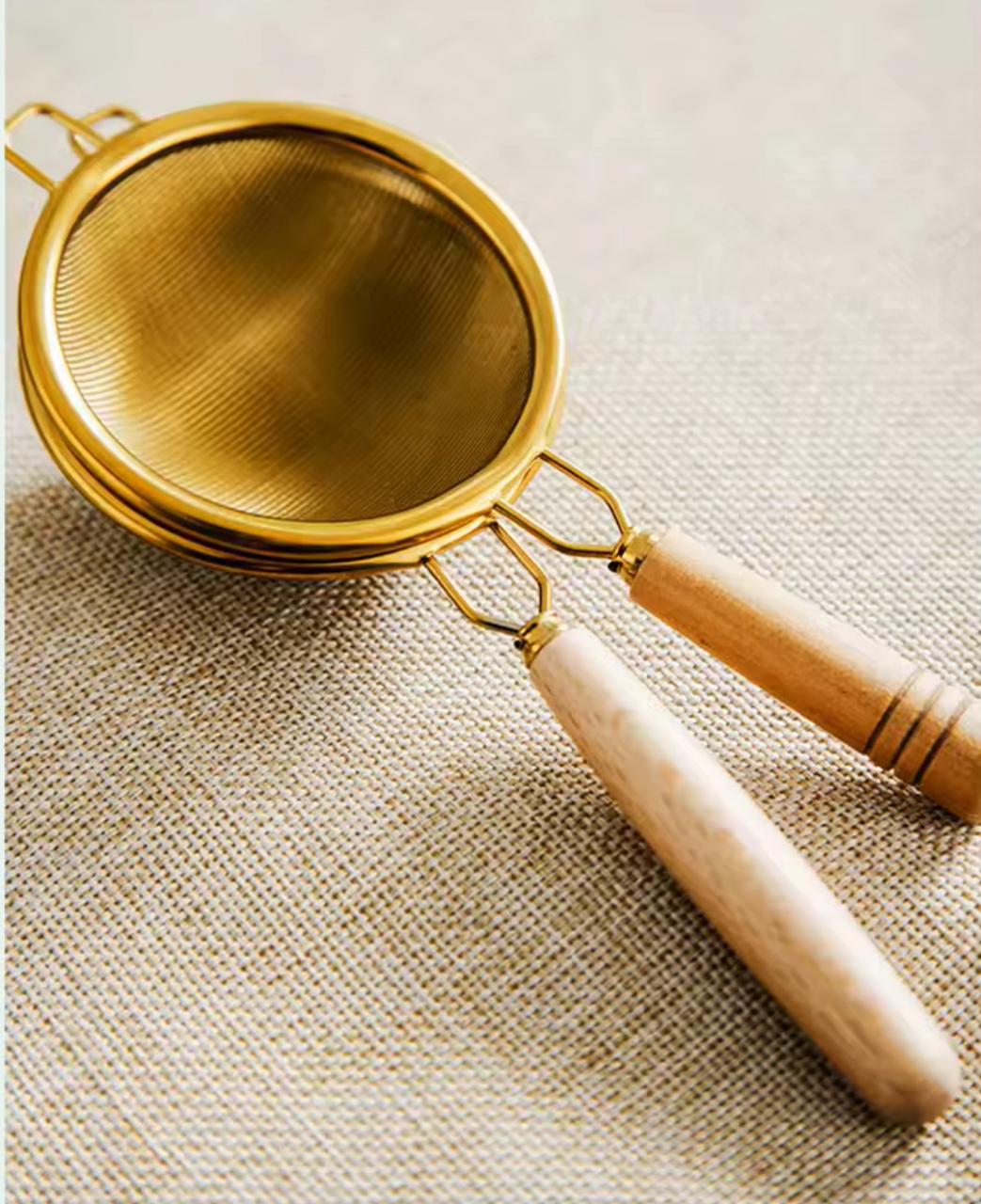 Introducing a tea strainer that brings a touch of luxury to your tea time. Crafted with a unique golden finish, this strainer is a blend of function and beauty. The handle comes in two elegant color options—dark brown and light brown—adding a rustic charm to its sophisticated design. Whether you’re steeping your favorite tea or dusting cinnamon or coffee powder on desserts, this strainer does it all with grace. Its golden sheen gives it a rich, aesthetic look that elevates your kitchen or dining setup, making it perfect not only for tea lovers but also for bakers and those who appreciate a touch of refinement in their kitchenware.
