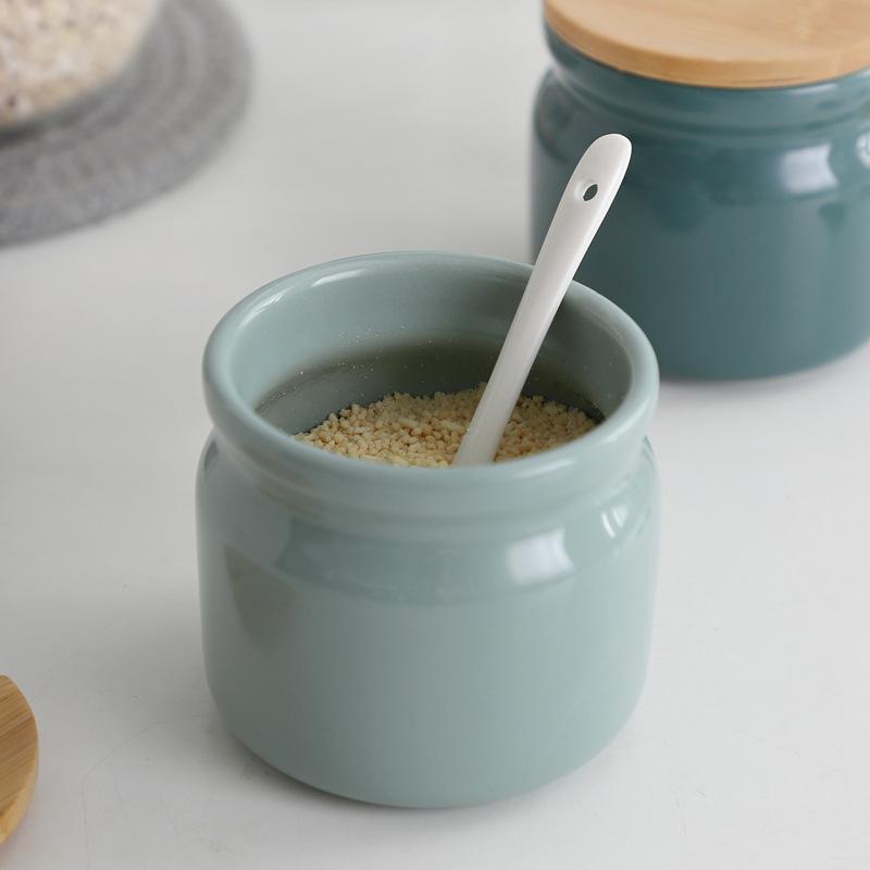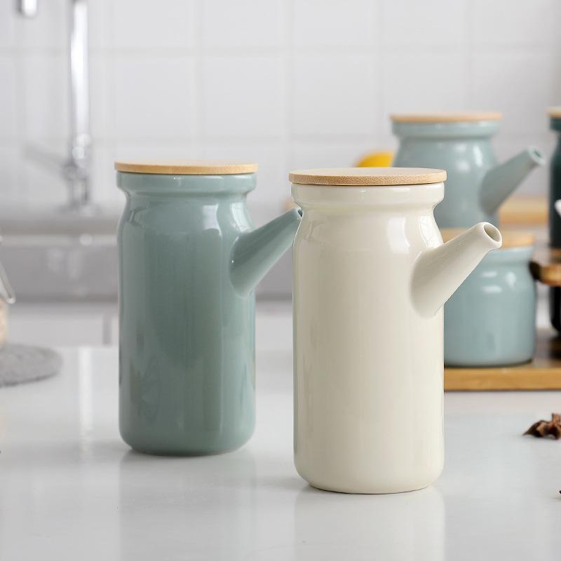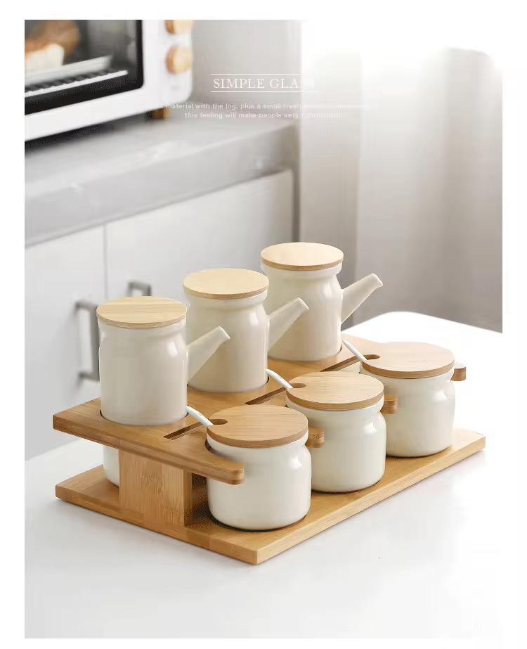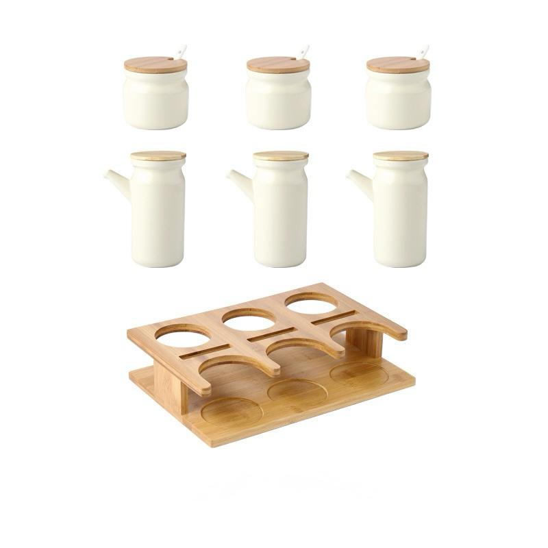 Designed for both beauty and functionality, this ceramic canister set provides an organized solution for your essential kitchen staples. With three ceramic spice jars and three oil canisters arranged neatly on a wooden tray, this set combines sleek design with everyday convenience. The spice jars come with matching wooden lids and spoons for easy use, while the oil canisters are ideal for storing your favorite oils. Whether in white or light blue, each piece adds a unique touch to your kitchen decor, making this set a practical and stylish addition.