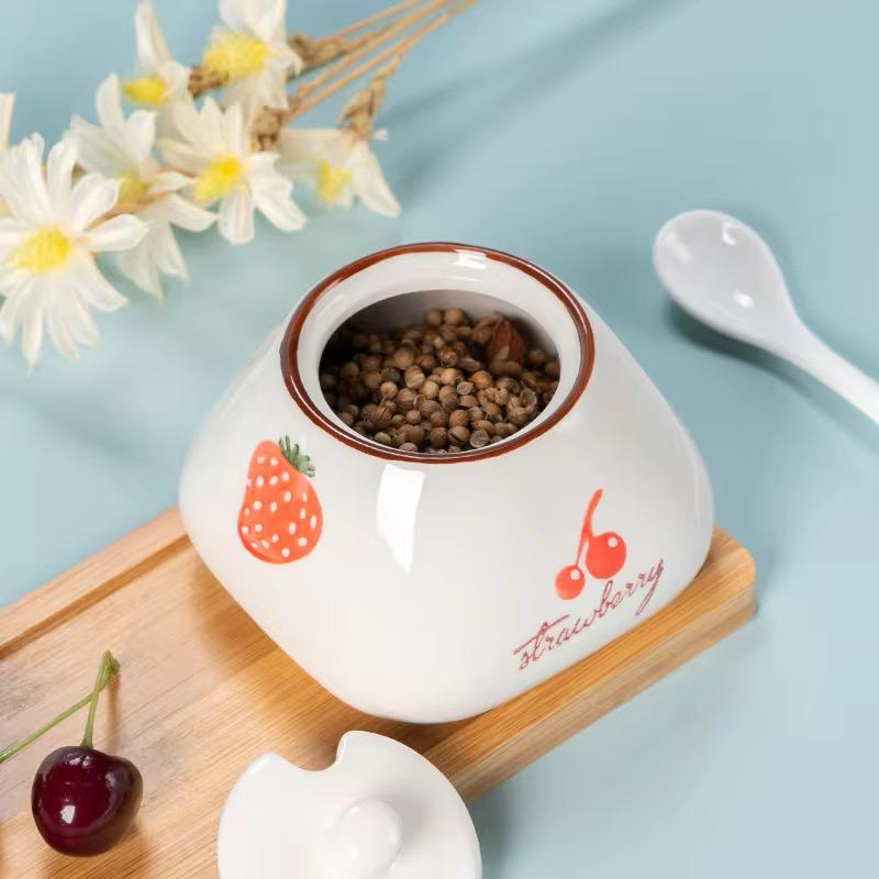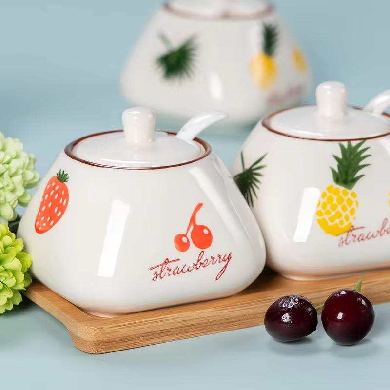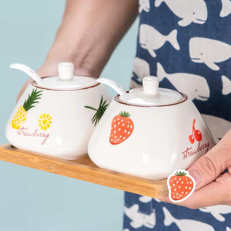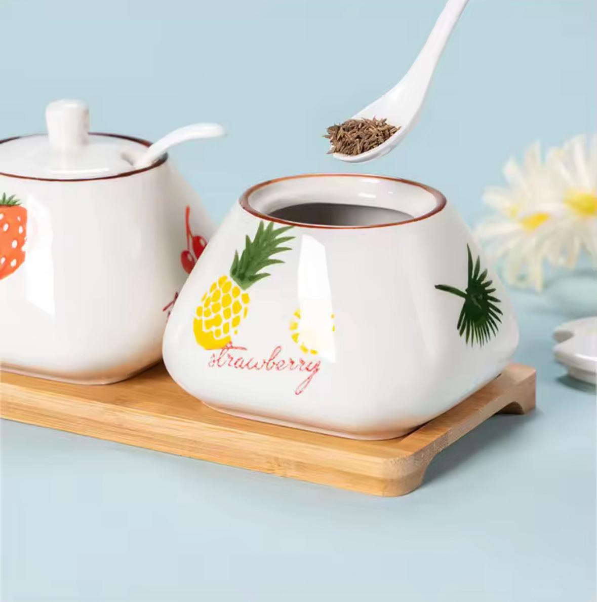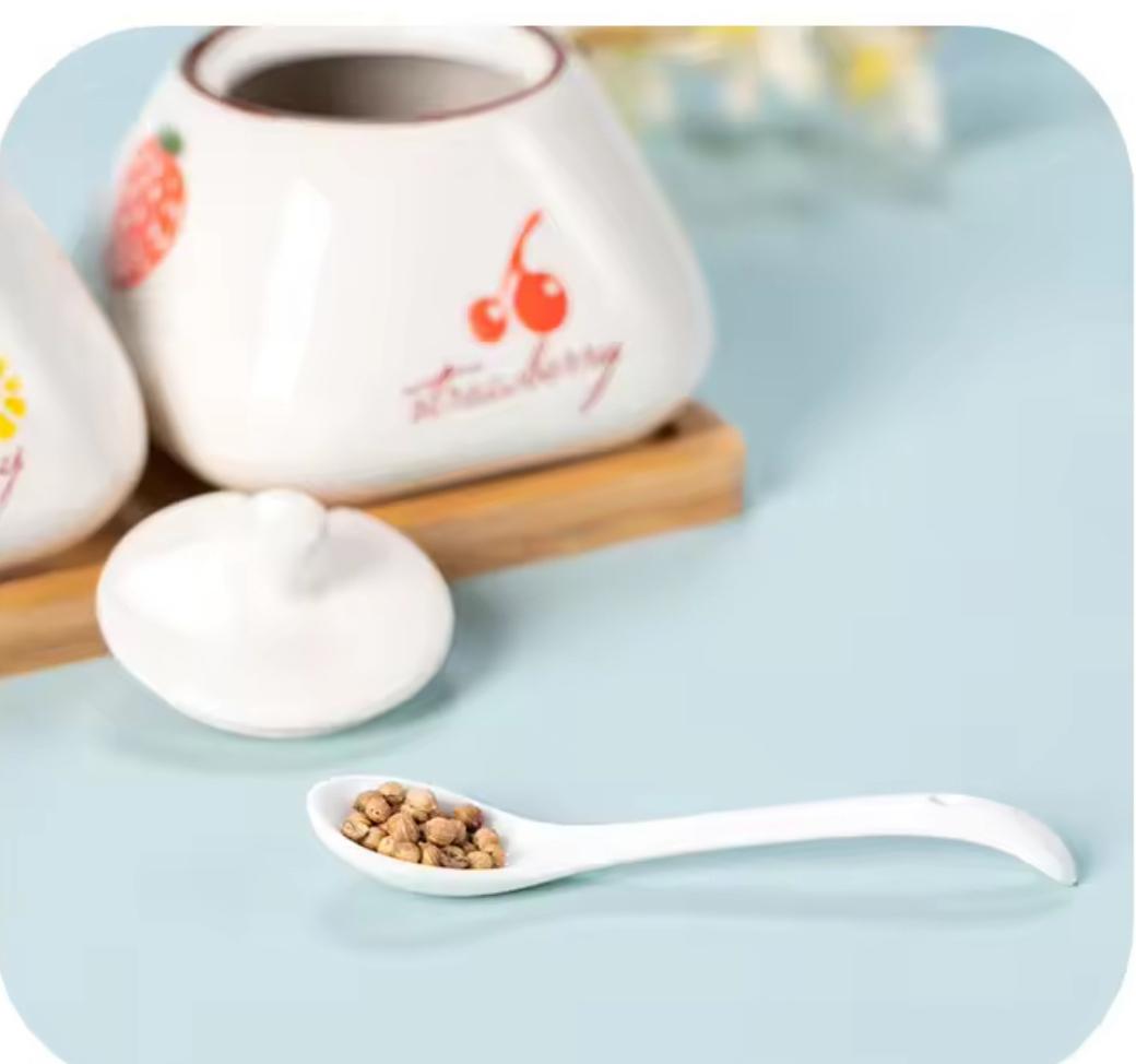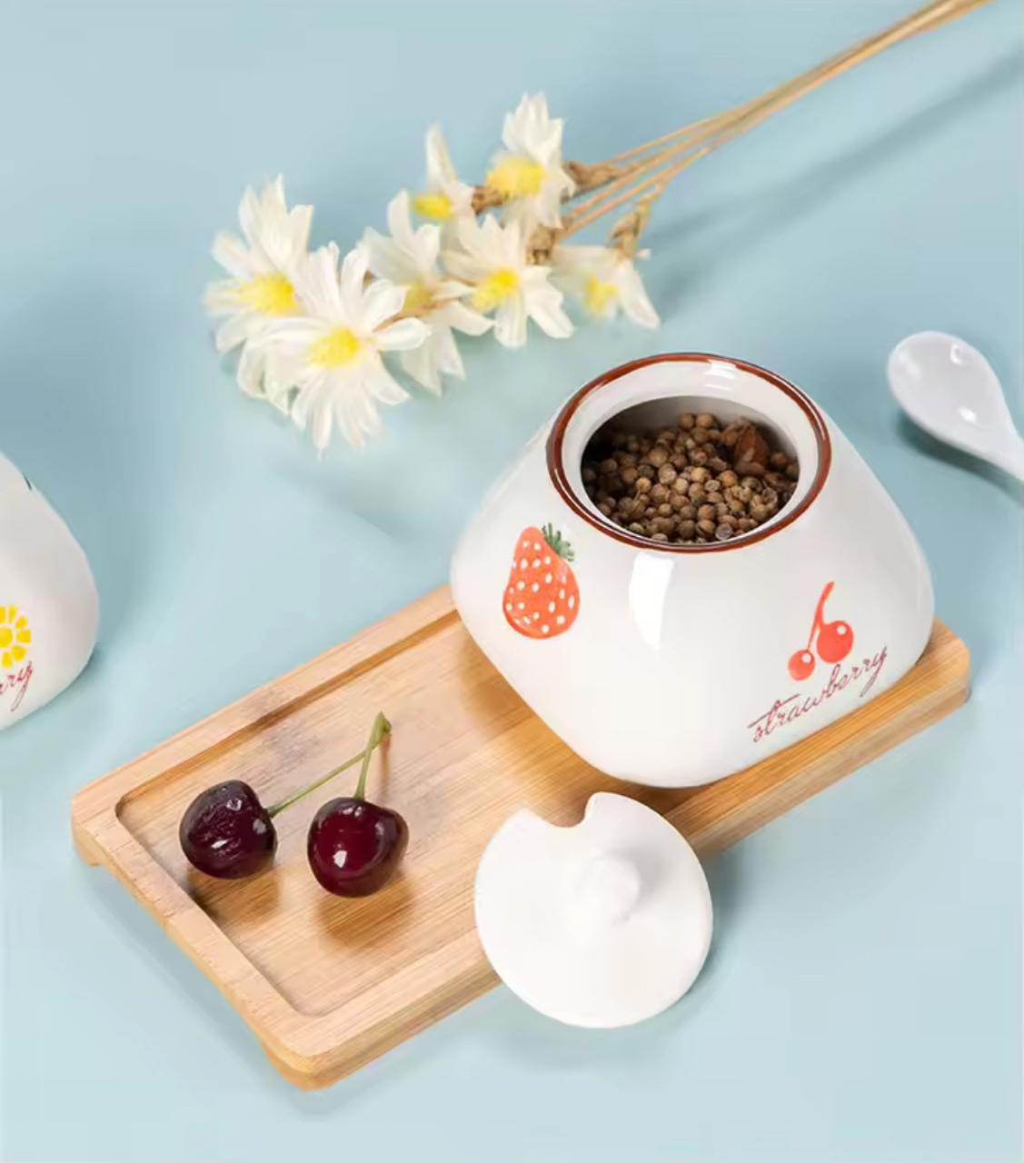 Each jar is crafted from premium ceramic, complete with a matching ceramic lid that has a built-in slot for the included ceramic spoon. The jars sit neatly on a sleek wooden tray that keeps your condiments organized in style.
