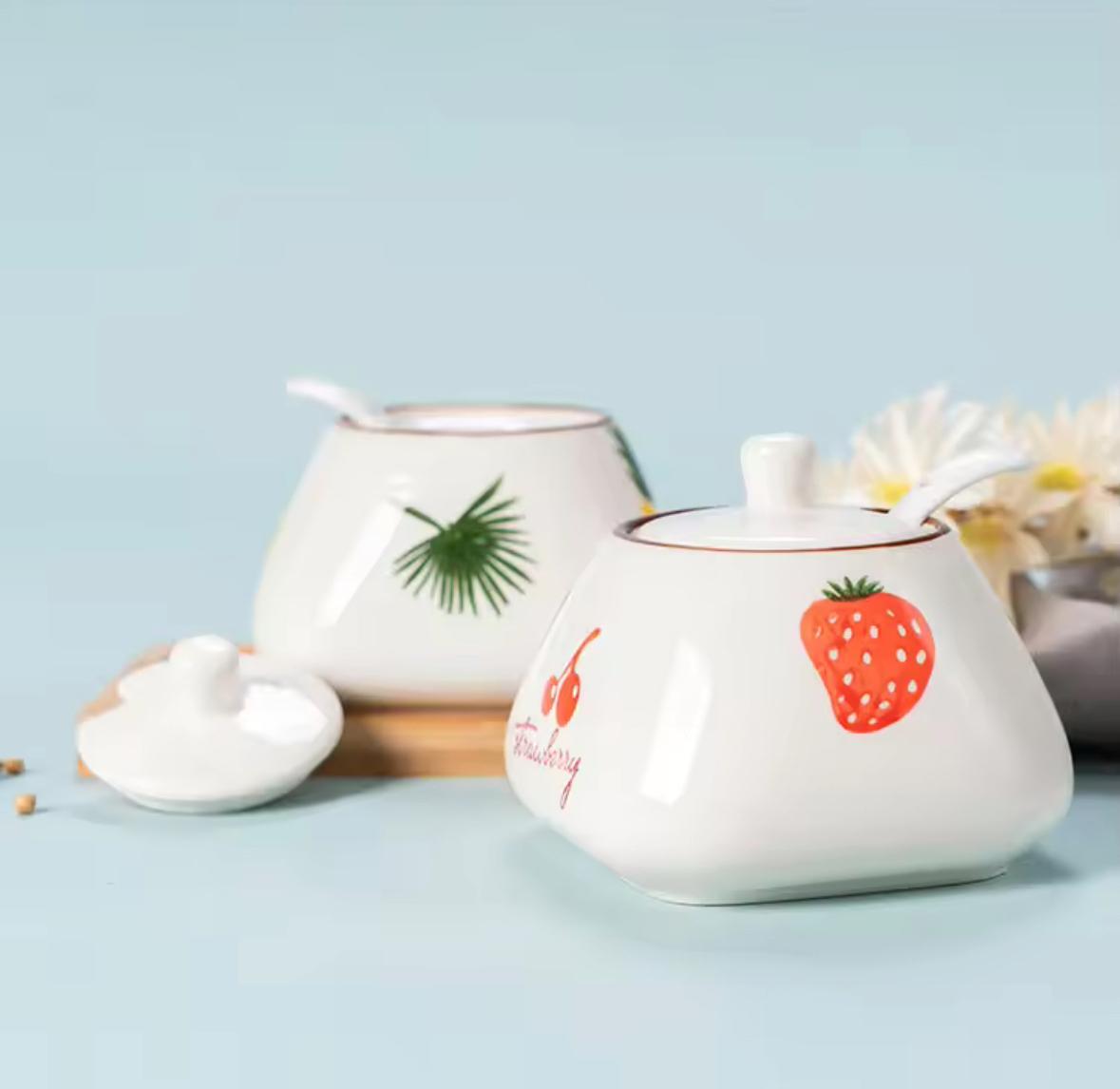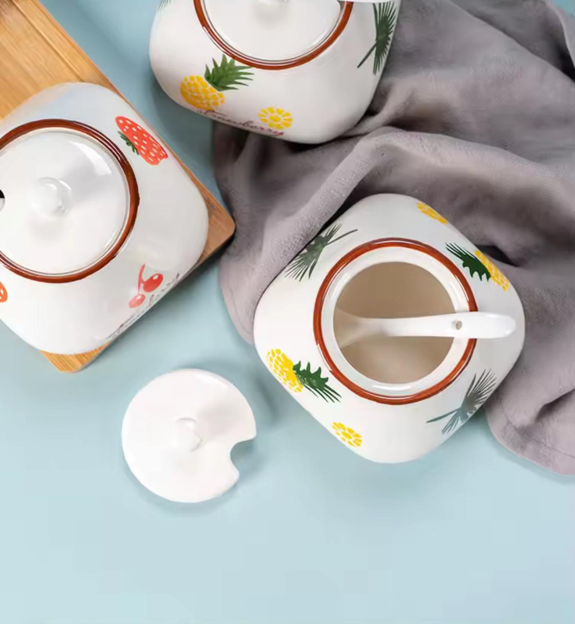 This adorable set of two white ceramic jars features playful fruit prints — one with strawberries, the other with pineapples — bringing a fun and tropical vibe to your countertop or dining table.