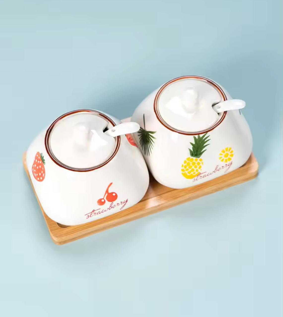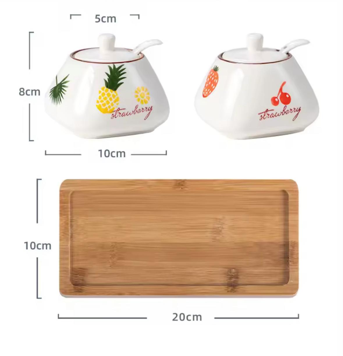 • Set includes: 2 ceramic jars, 2 ceramic spoons, 2 ceramic lids, and 1 wooden tray