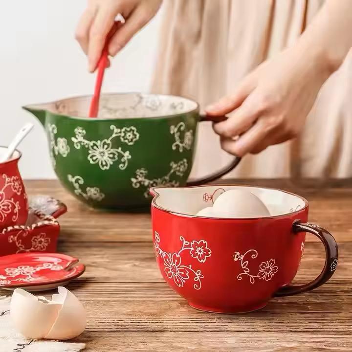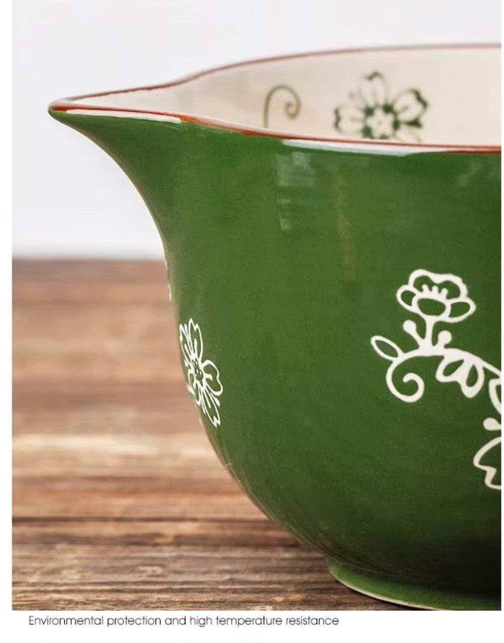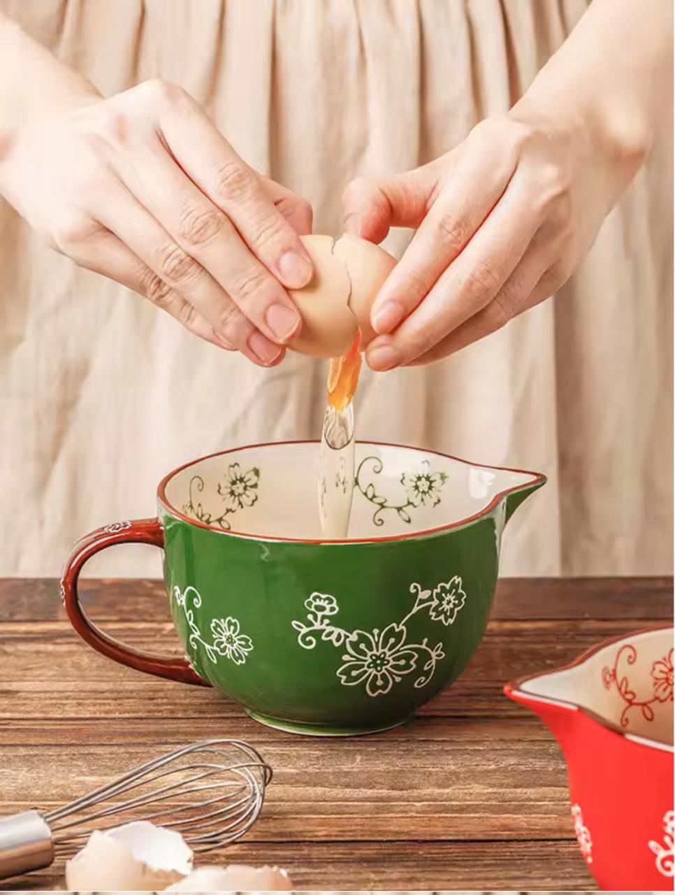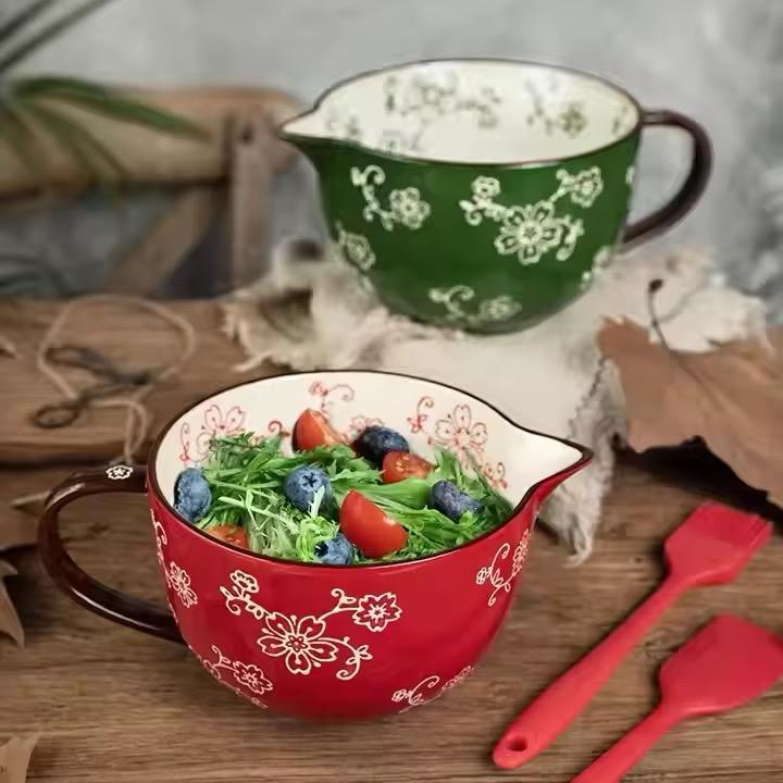 A sturdy side handle, inspired by classic mug design, offers a firm and comfortable grip, making it perfect for heavy mixing or one-handed use. The bowl comes in two gorgeous earthy shades — olive green and festive red, adorned with white hand-painted floral patterns reminiscent of traditional Indian motifs.